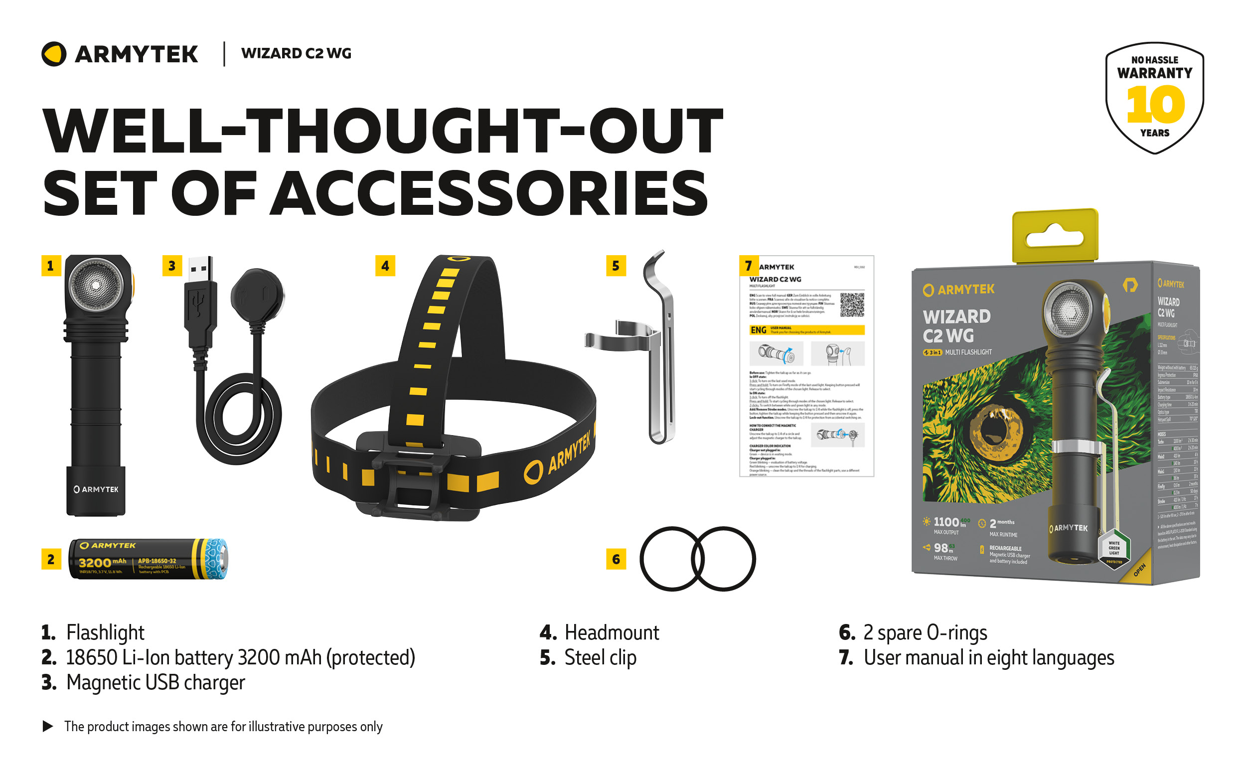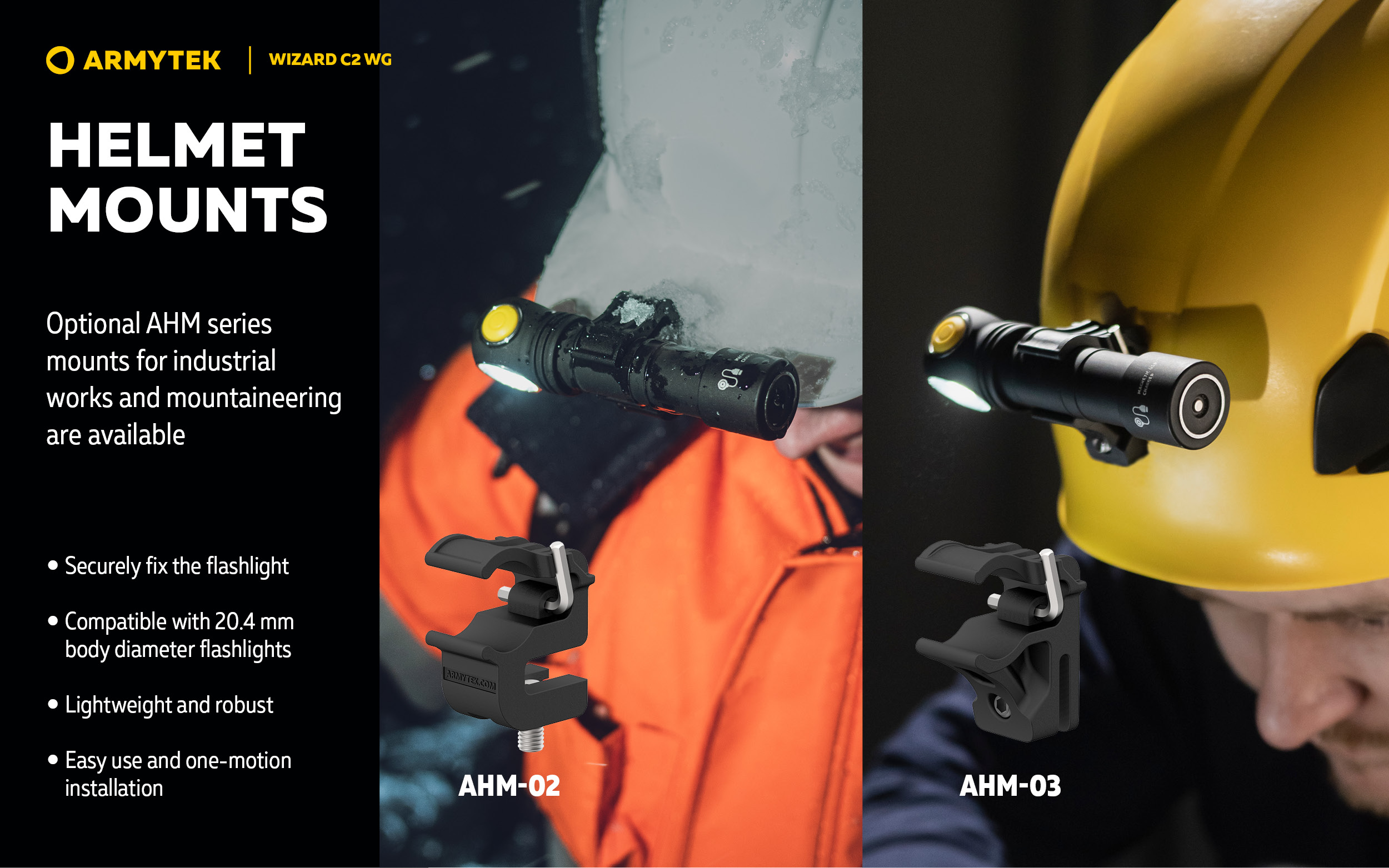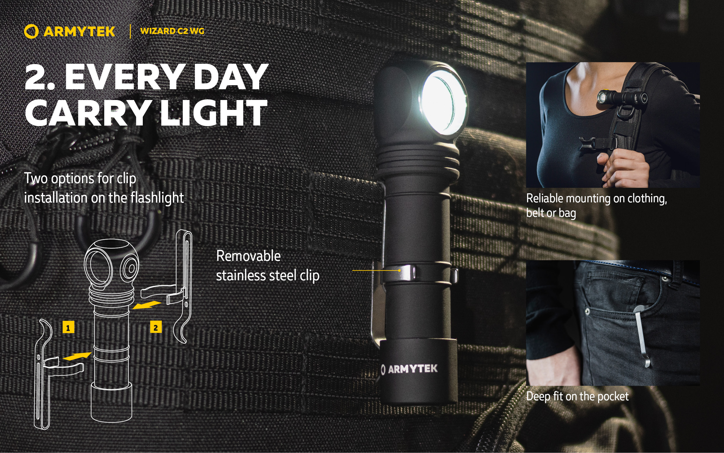 The flashlight has several installation options. Powerful magnet in the tailcap allows attaching the flashlight to any metal surface. Comfortable headmount and steel clip to fix to clothes or backpack are included in the set. Wizard C2 WG is also compatible with optional AHM series helmet mounts.