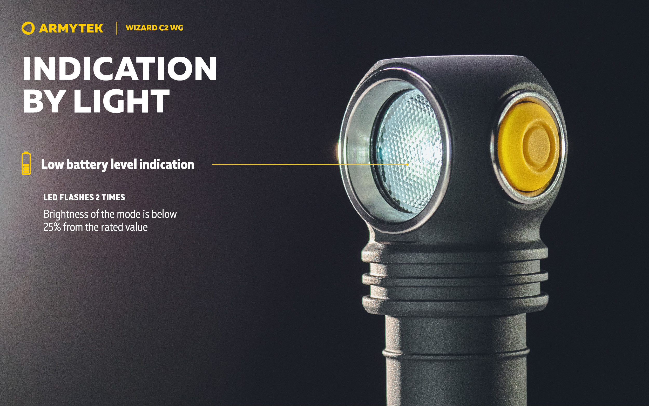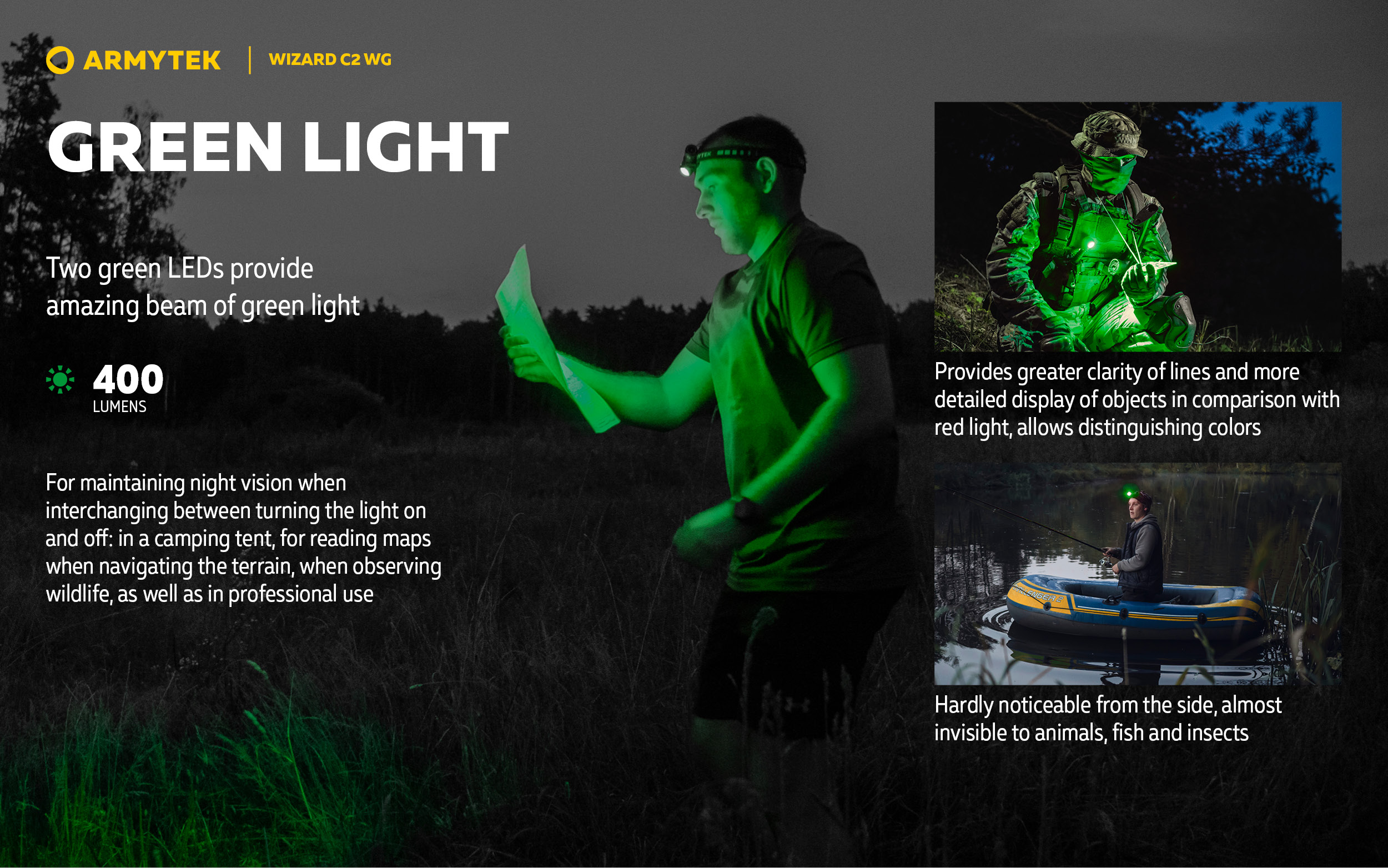 Just like the red one, green output is efficient during fog and in other conditions of limited visibility, and is comfortable for long-term application. However, green light has an important advantage: it provides greater clarity of lines and more detailed display of objects, allows distinguishing colors. It is almost invisible from the side, and is also not perceived as a threat by animals and birds, which is especially useful when observing wildlife or hunting. The use of Wizard C2 WG in green light modes does not attract annoying insects.