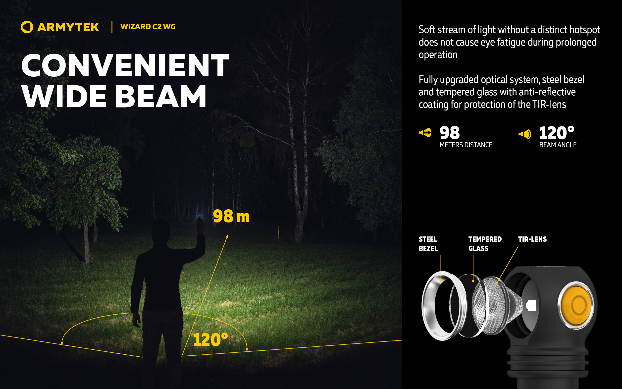 - Convenient wide beam of fully upgraded optical system, steel bezel and tempered glass with anti-reflective coating for protection of the TIR-lens.