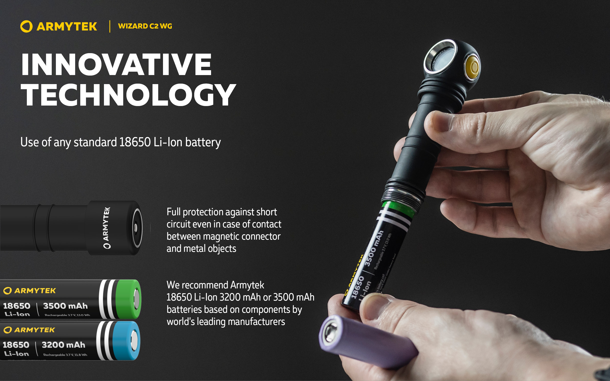 - Innovative technology allows using any standard 18650 Li-Ion battery. Full protection against short circuit even in case of contact between magnetic connector and metal objects.