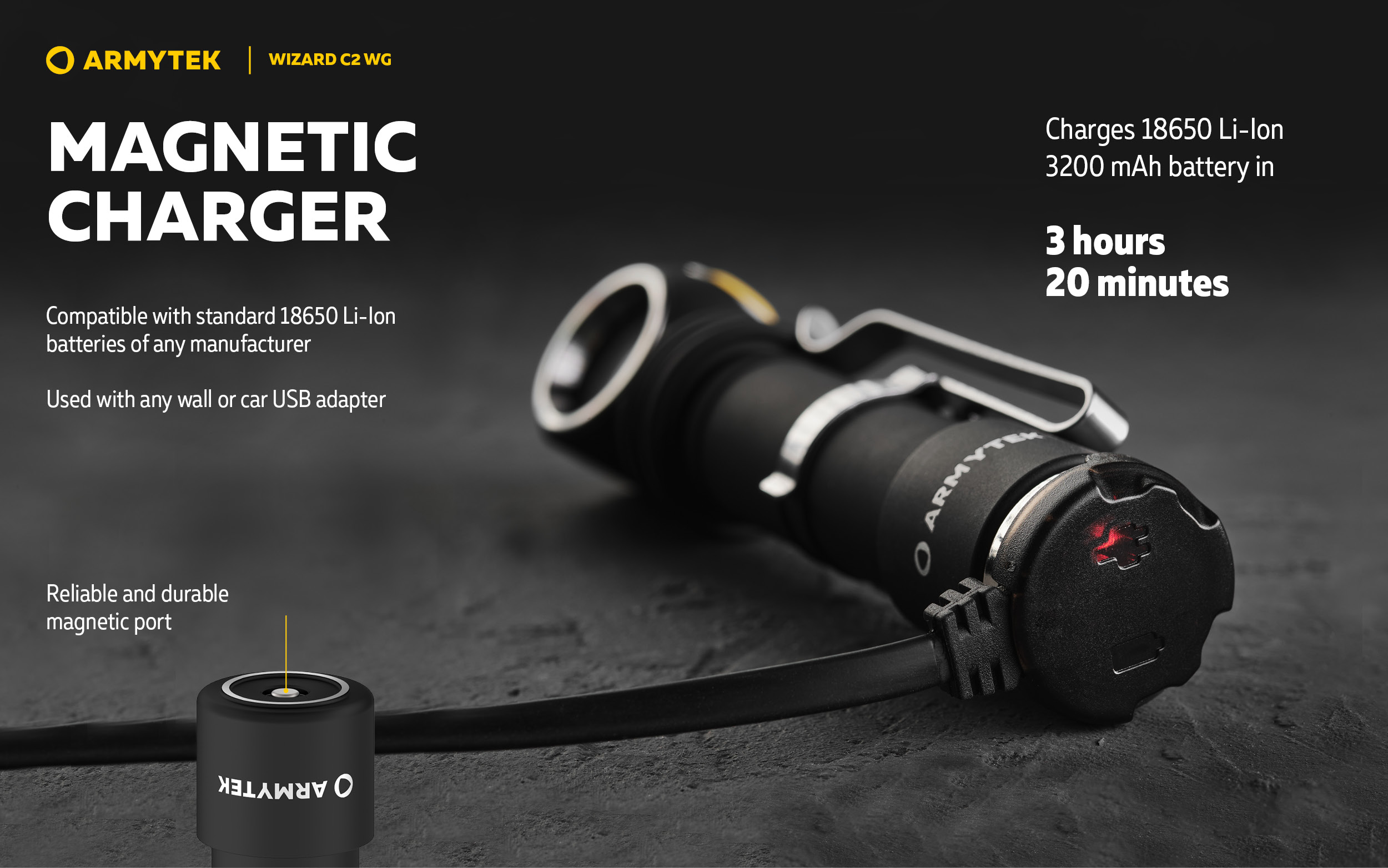 Fast magnetic charger: included 18650 Li-Ion 3200 mAh battery is charged in 3 h 20 min.