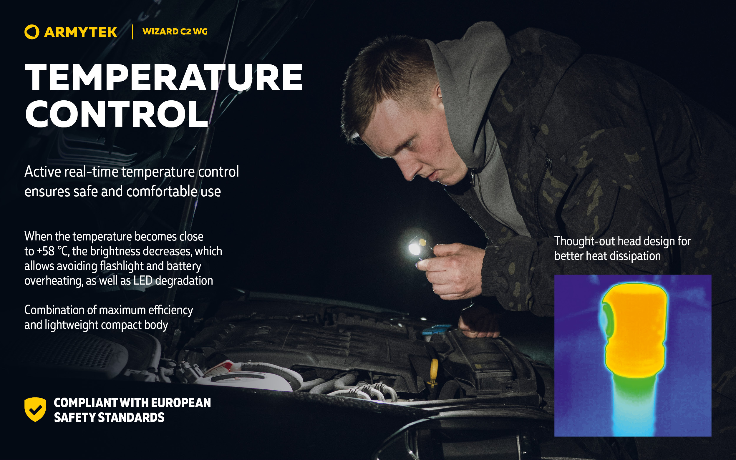 The completely new second-generation driver S-Tek™ enables the flashlight to emit bright and constant light even when the battery 18650 Li-Ion is almost discharged.