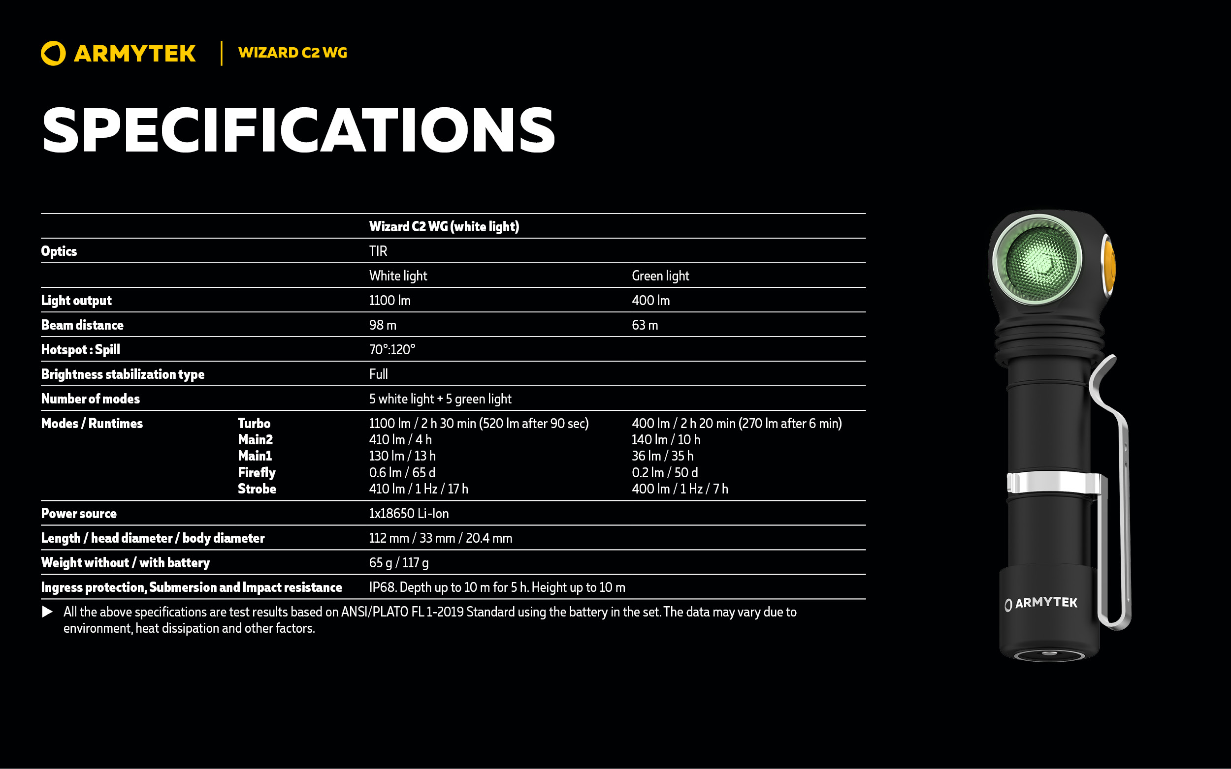 | Turbo | 1100 lm / 2 h 30 min (520 lm after 90 sec) |