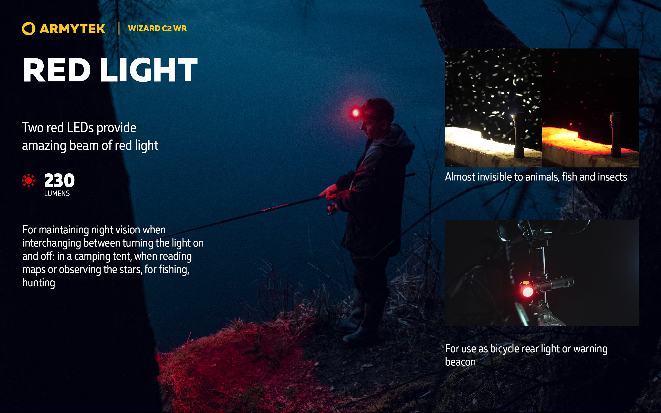 Additional red light with 230 lumens is more effective during fog or other conditions of limited visibility. It can be applied as a rear bike light or a warning beacon. Fishers and hunters will surely appreciate the model: red light won't scare off animals or fish. Wizard C2 WR also has an advantage for outdoor activities — it allows to use the flashlight without attracting annoying insects.