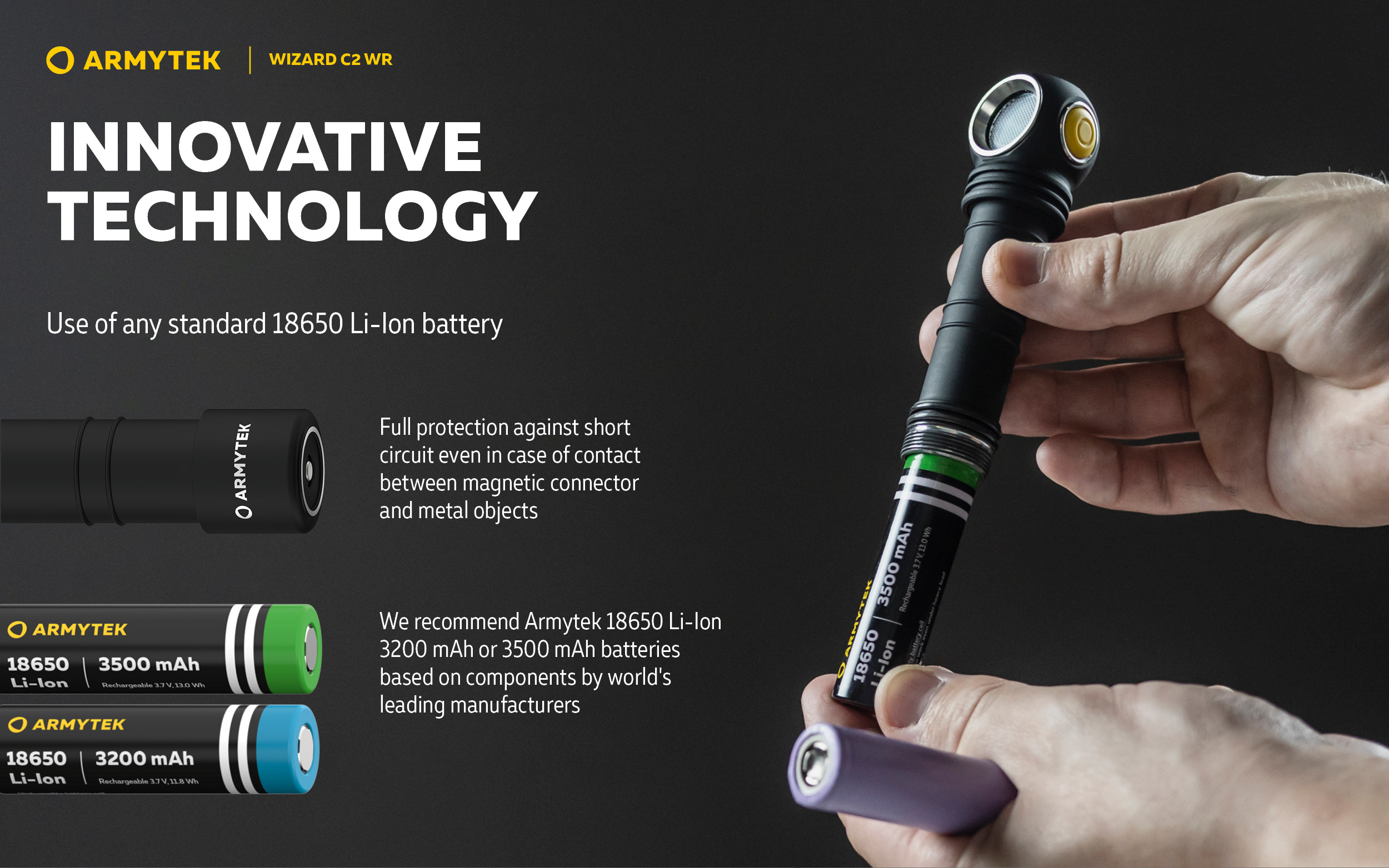 - Innovative technology allows using any standard 18650 Li-Ion battery. Full protection against short circuit even in case of contact between magnetic connector and metal objects.