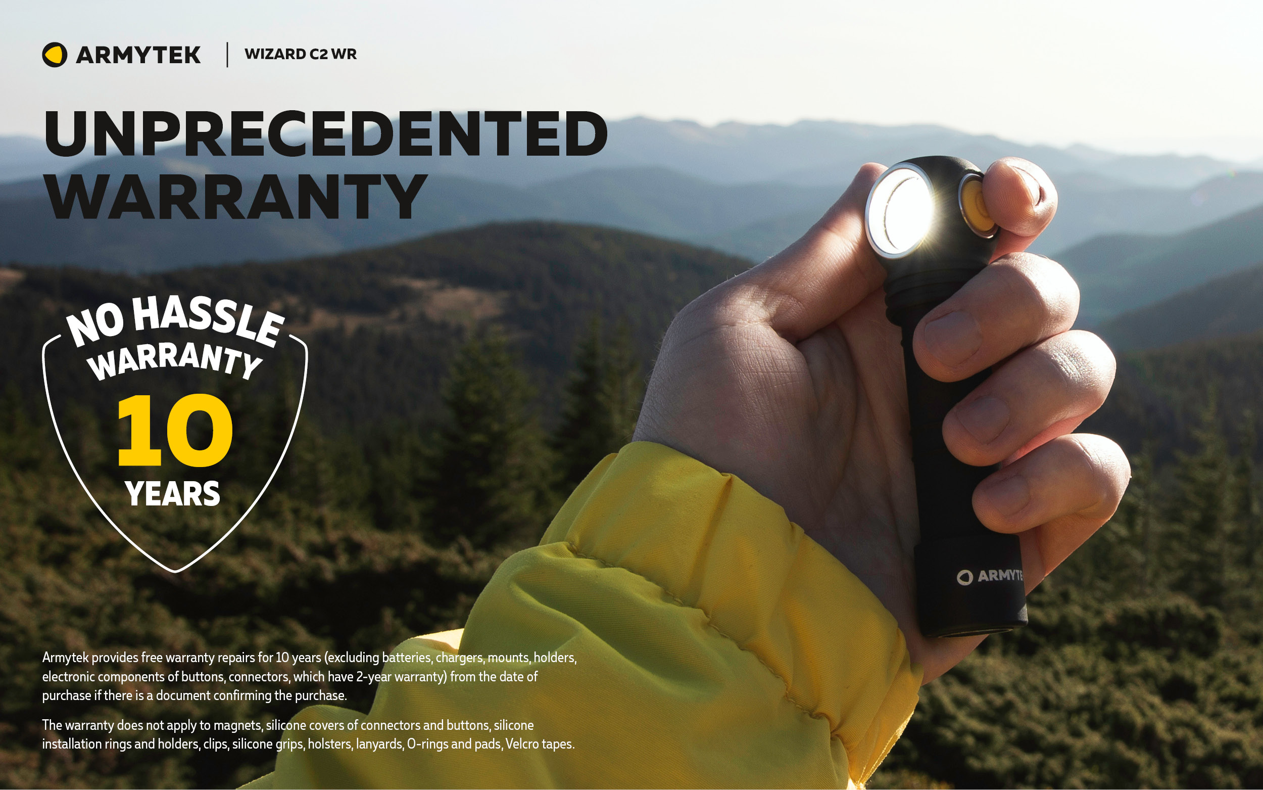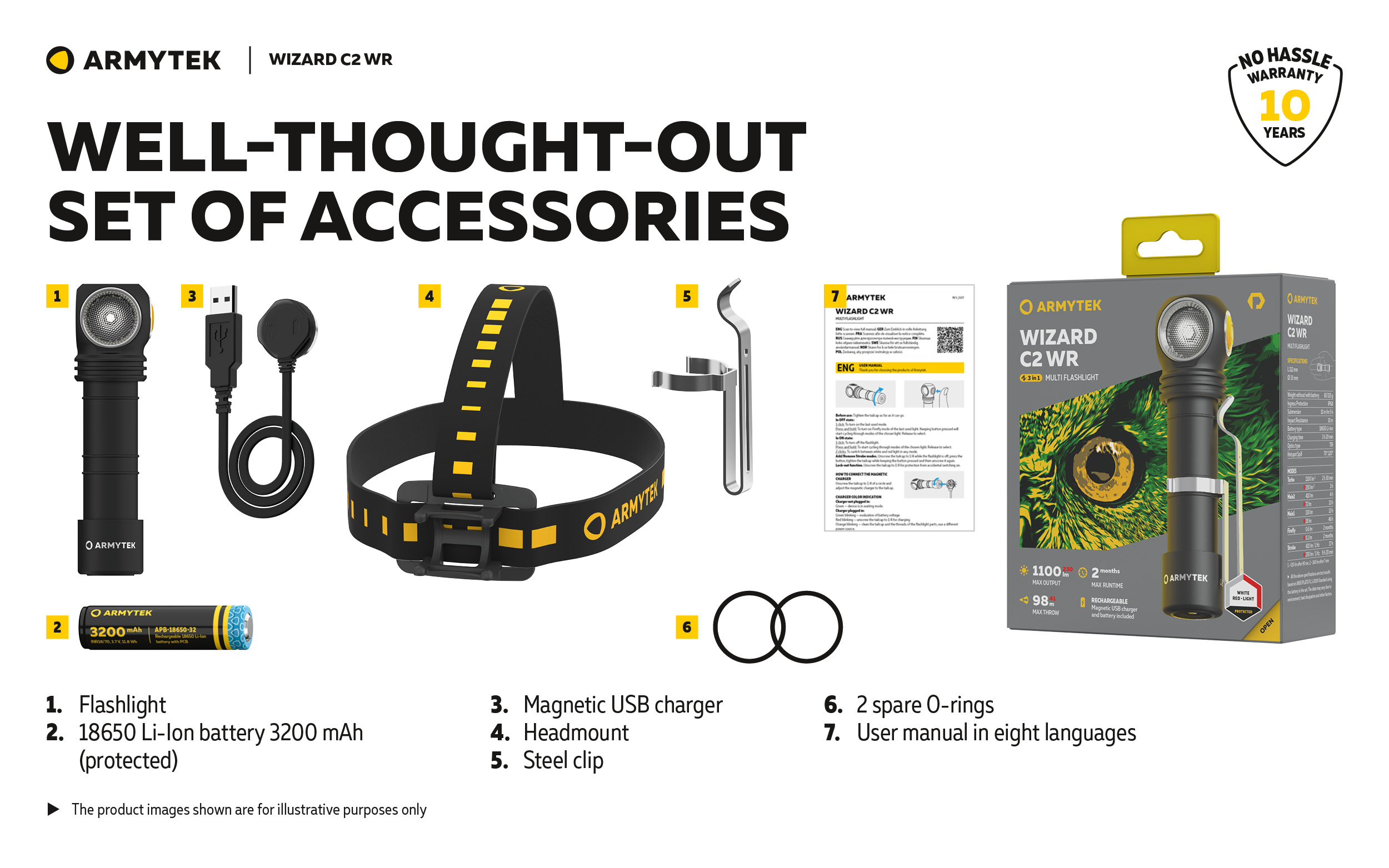 Accessories in the set provide several attachment options: on the head using the headmount, on clothes or backpack strap with the clip, on metal surfaces thanks to the magnet in the tailcap. Wizard C2 WR is also compatible with the universal mount ABM-01 and AHM series helmet mounts for industrial works and mountaineering.