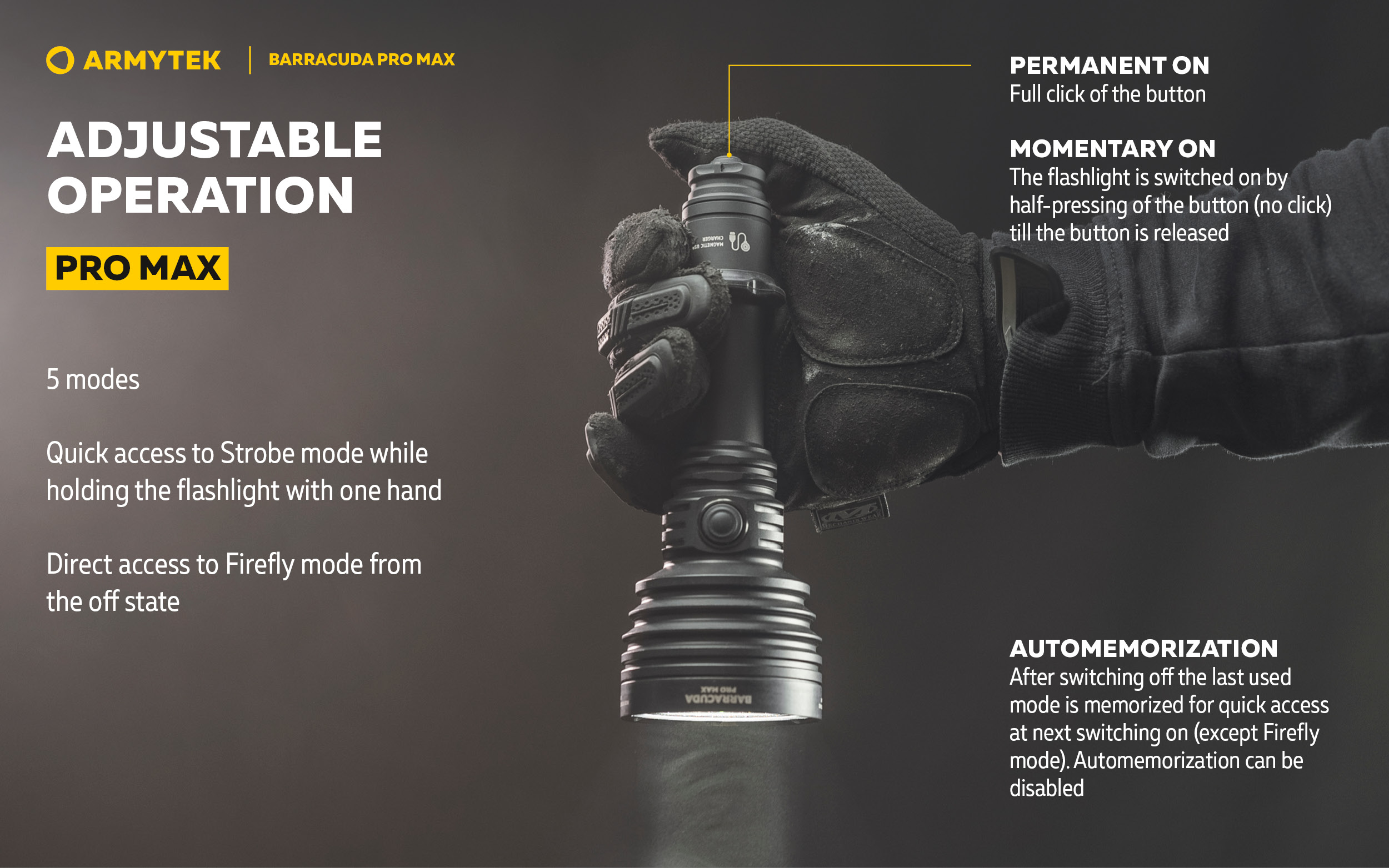 - Pro Max Direct access to Strobe mode while holding the flashlight with one hand.