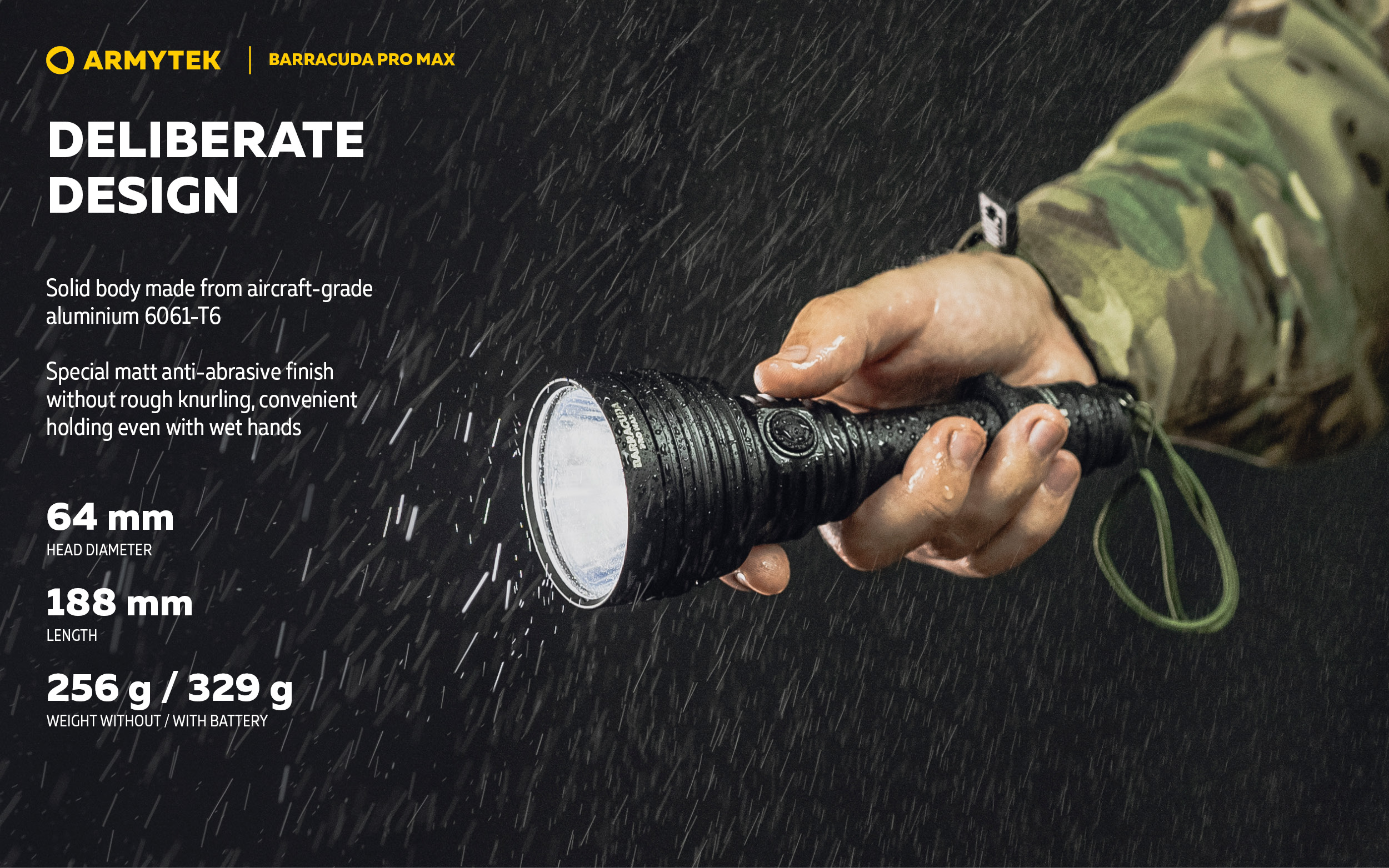 Barracuda Pro Max is a flashlight with an impressive throw distance of 1000 meters and a brightness of 2800 lumens. The model is intended for conducting search operations: a long-range beam with a distinct central spot makes it possible to highlight objects located at a considerable distance. The thoroughly thought-out design allowed achieving maximum ergonomics: high brightness and throw distance are provided by only one LED, which means the flashlight is not made heavier by additional reflectors and other elements of the optical system. The presence of two operation buttons provides quick access to the necessary modes.