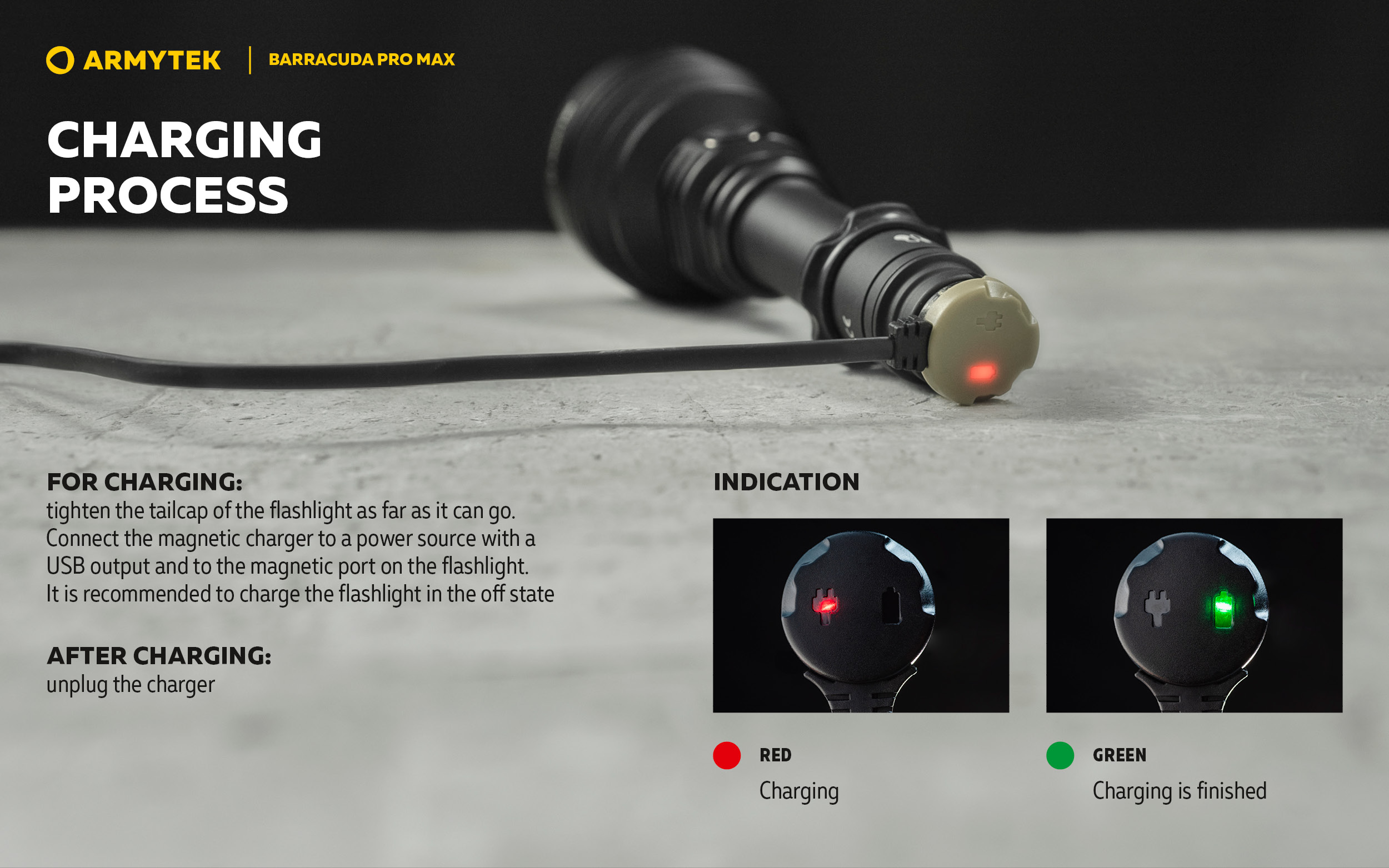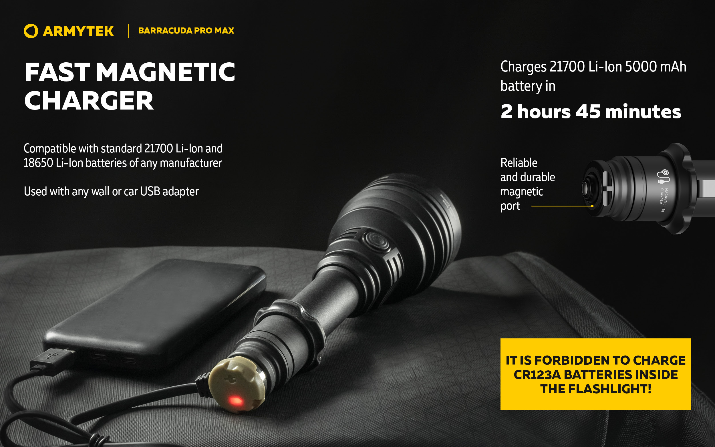Fast magnetic charger: the included 21700 Li-Ion 5000 mAh battery is charged in 2 h 45 min.