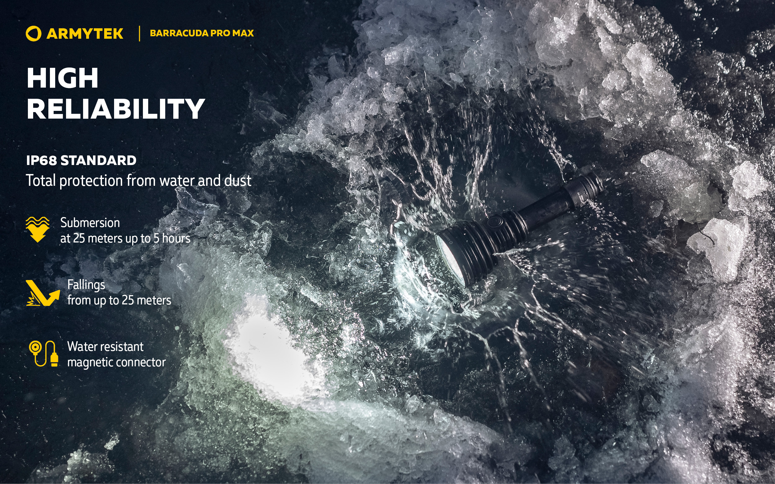 - Total protection from water, dirt and dust in accordance with IP68 standard — flashlight continues to work even after submersion at 25 meters depth. Withstands fallings from the 10th floor.