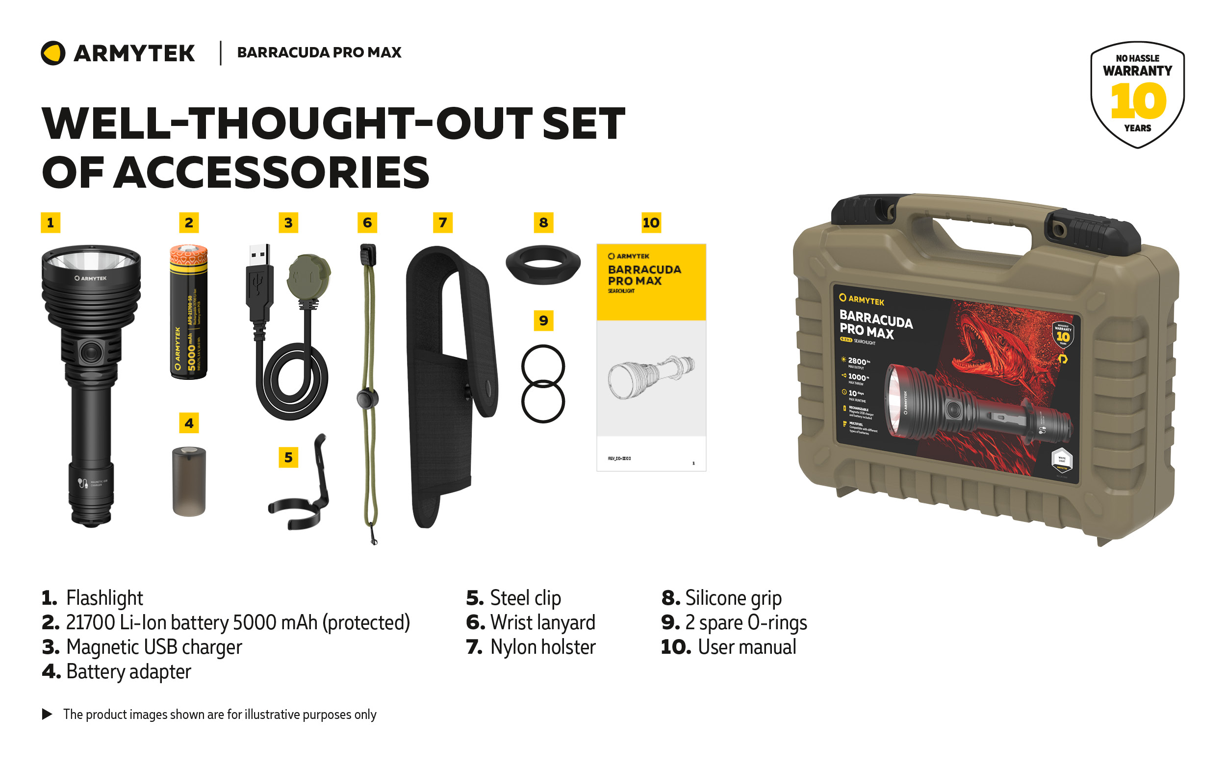 Barracuda Pro Max works not only on the included power supply, but also on any standard 21700 Li-Ion battery, as well as, thanks to the adapter, on an 18650 Li-Ion battery or two CR123A lithium batteries. The variability of the power supplies makes it possible to significantly increase the operating time. The flashlight is compatible with the original remote switches and weapon mounts and can be used as a tactical light.