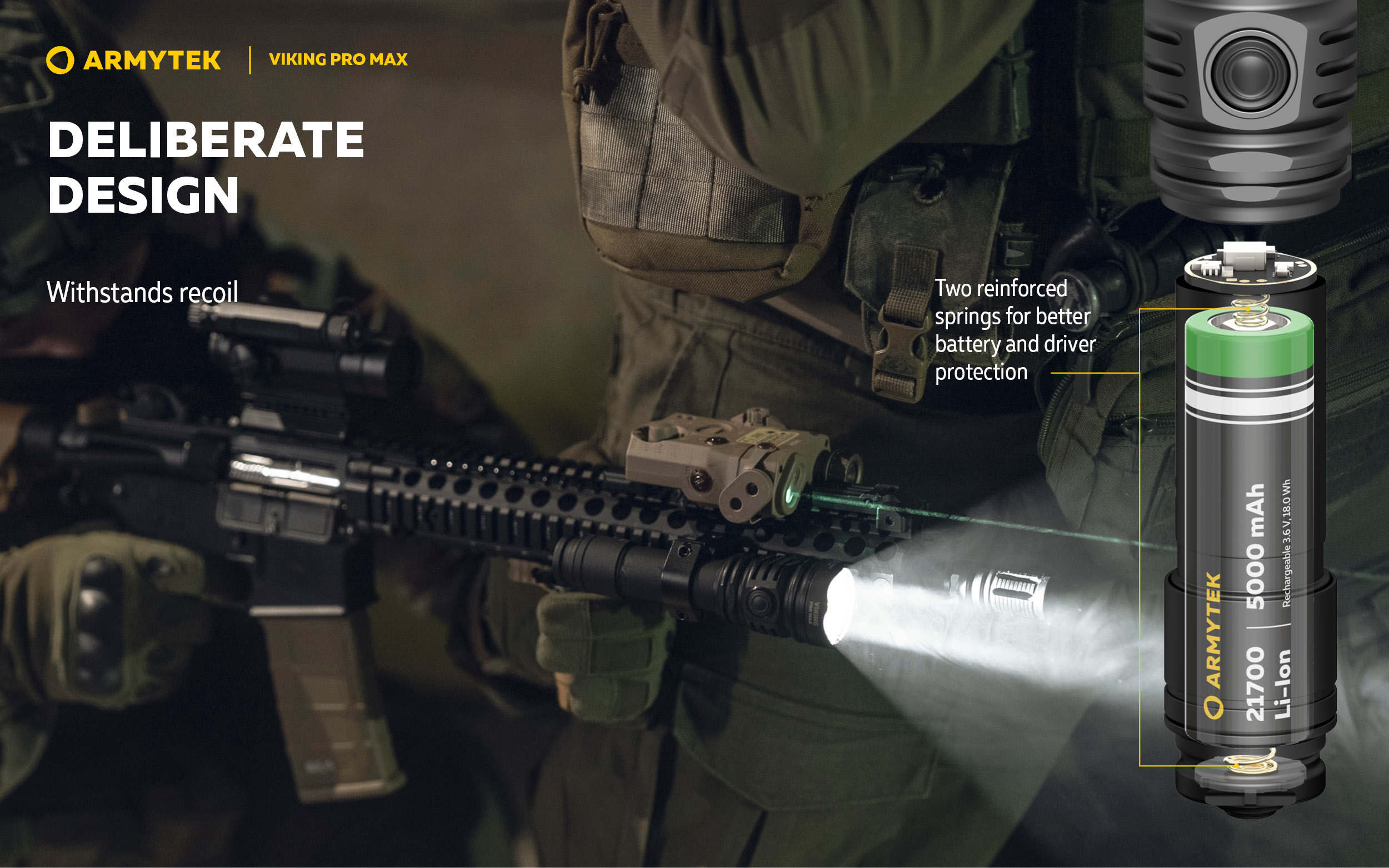 - The use of two reinforced springs in the design of the flashlight for better protection of the battery and the driver. The flashlight withstands recoil.