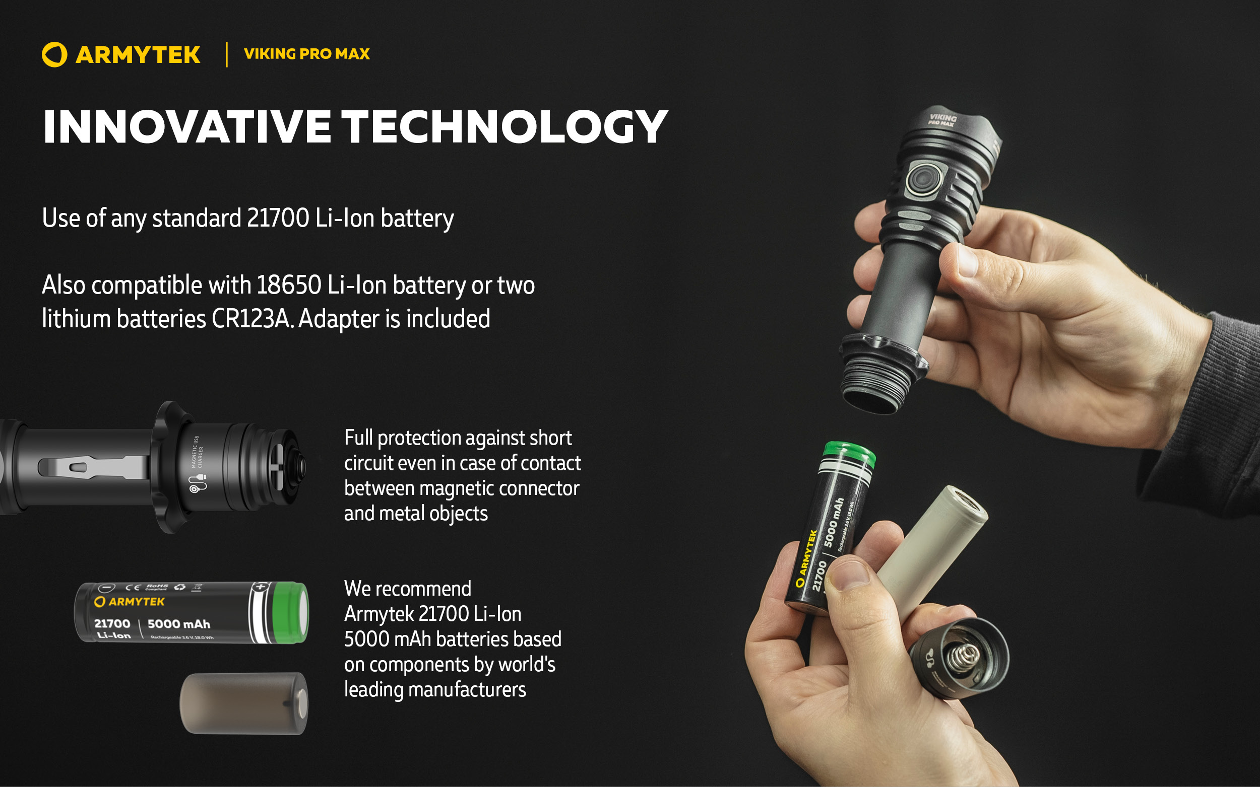 - Innovative technology allows using any standard 21700 Li-Ion or 18650 Li-Ion battery. Full protection against short circuit even in case of contact between magnetic connector and metal objects.