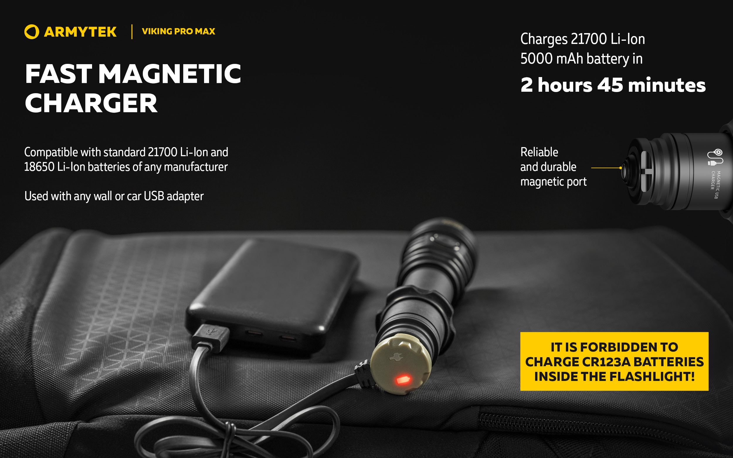 Fast magnetic charger: the included 21700 Li-Ion 5000 mAh battery is charged in 2 h 45 min.
