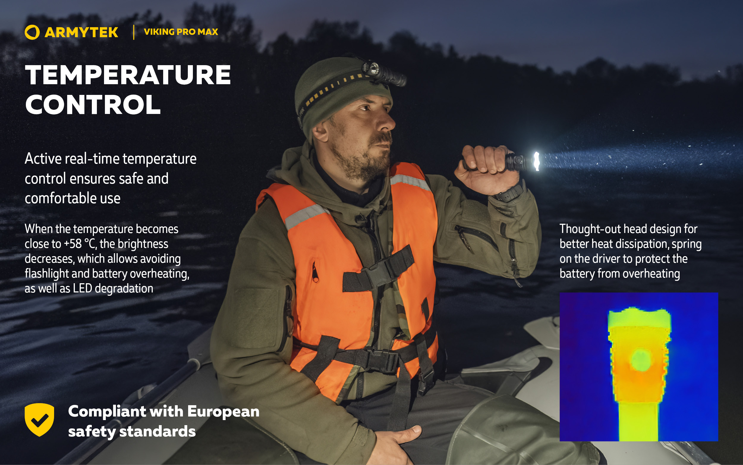 Advanced active real-time temperature control: ensures safe and comfortable use. When the temperature becomes close to +58 °C, the brightness decreases, which allows avoiding flashlight and battery overheating, as well as LED degradation. Compliant with European safety standards