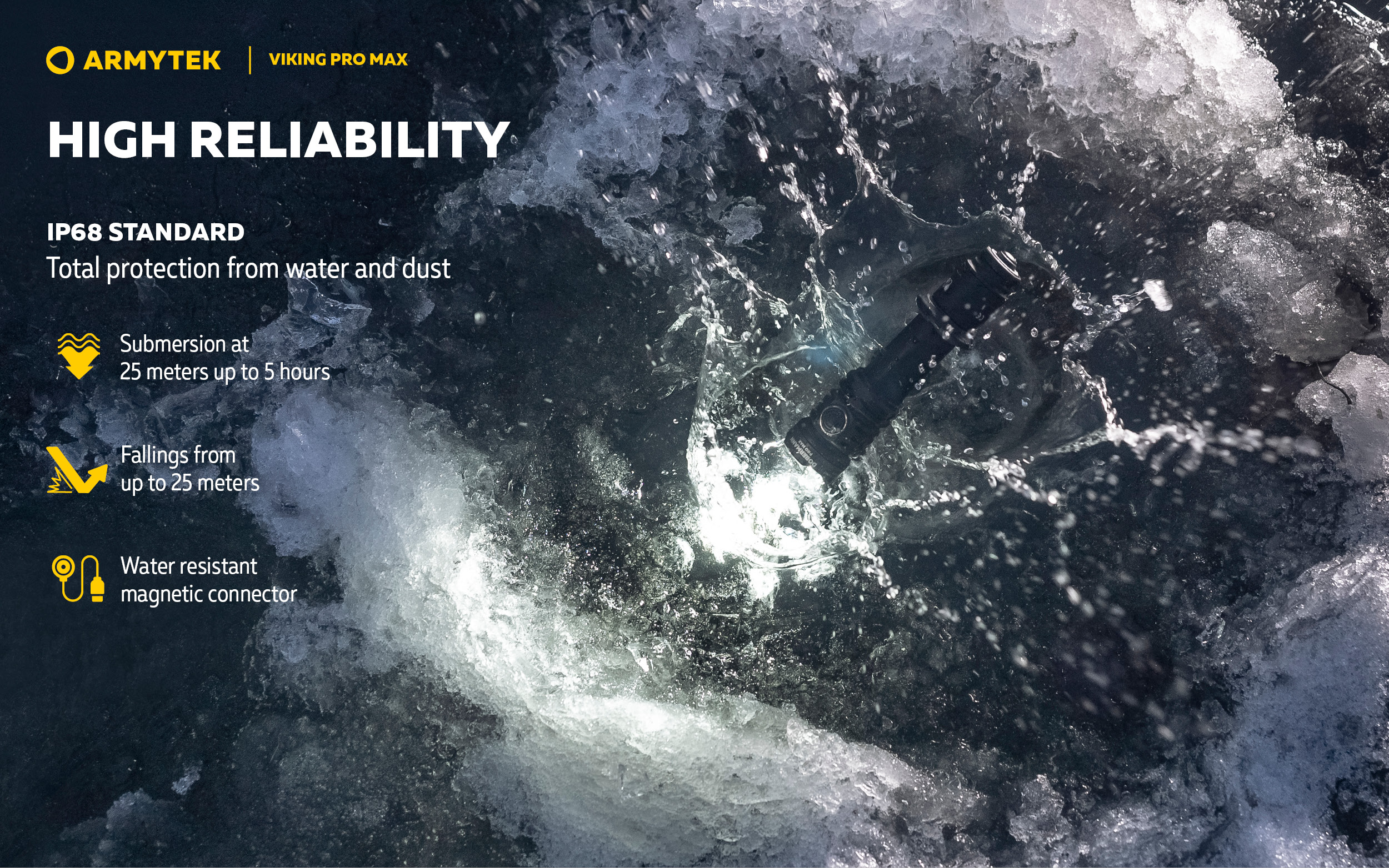 - Total protection from water, dirt and dust in accordance with IP68 standard — flashlight continues to work even after submersion at 25 meters depth. Withstands fallings from the 10th floor.