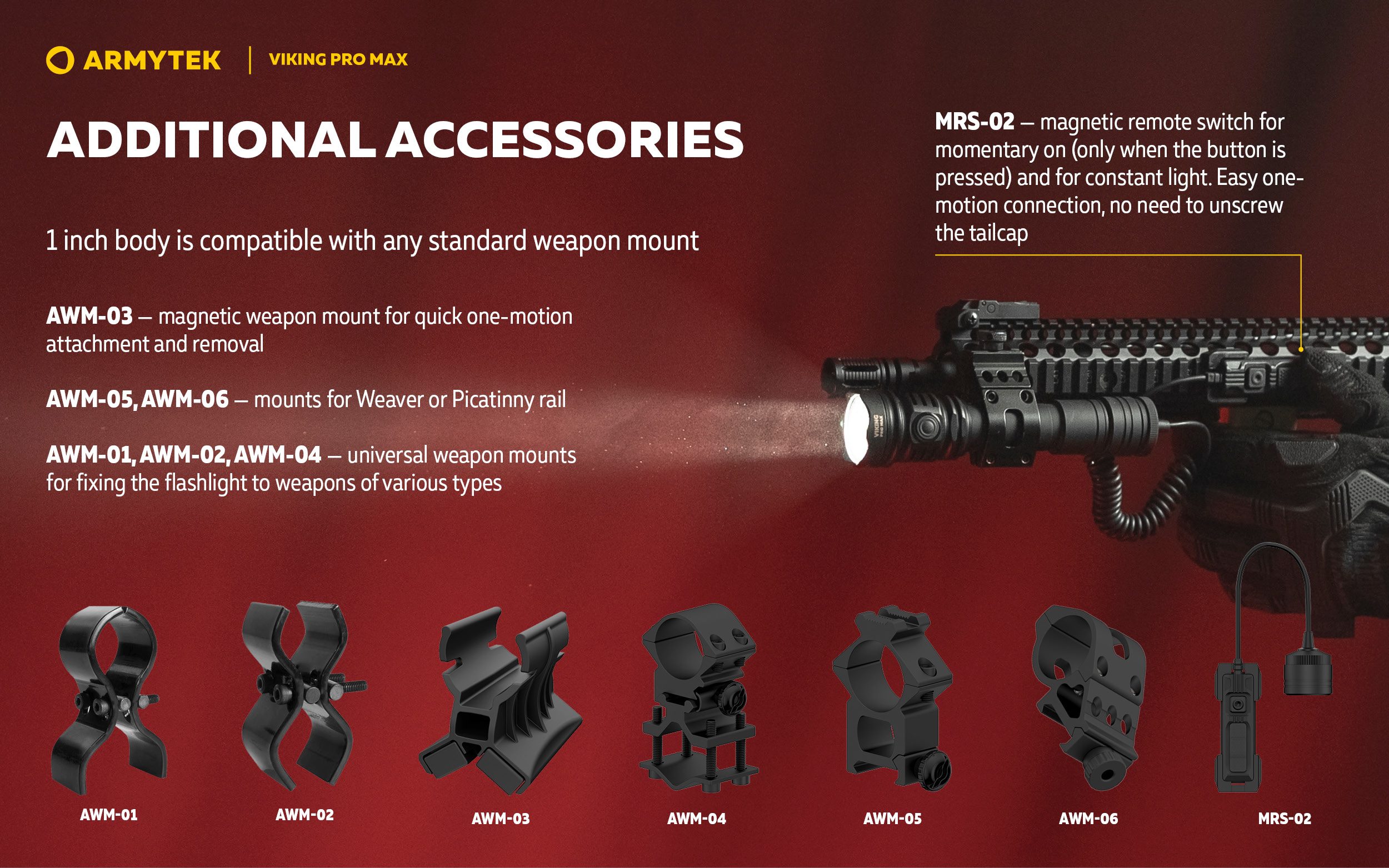 - Standard 1 inch body is compatible with tactical accessories.