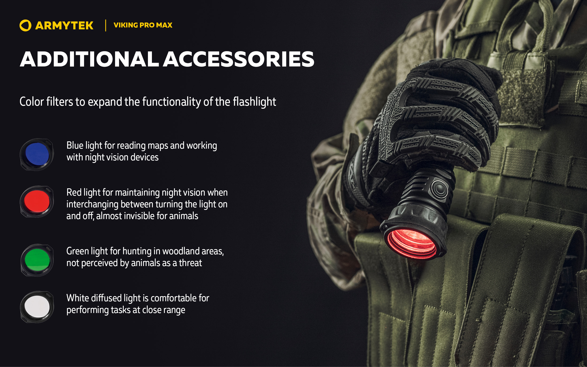 Viking Pro Max is a tactical flashlight with an impressive brightness of 5300 lumens for special tasks and for hunting. Large central spot and wide side spill make Viking Pro Max perfect for short- and medium-range use. The optimal choice for highlighting a significant area in open terrain and large spaces. The presence of two operation buttons provides quick access to the necessary modes when using the flashlight as a hand-held one.