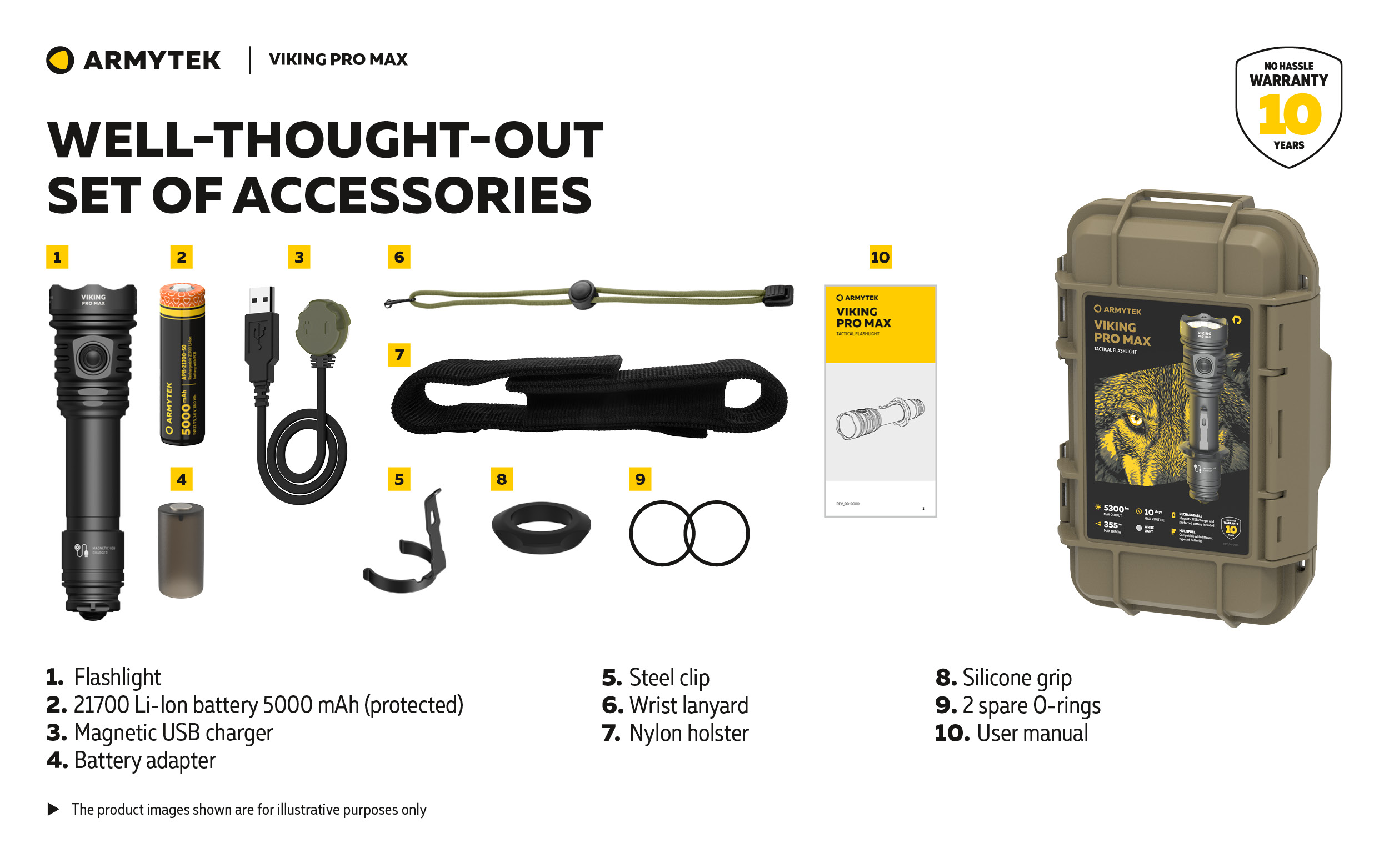 Ready-to-use solution: 21700 Li-Ion 5000 mAh battery, battery adapter for use of 18650 Li-Ion battery or CR123A batteries, fast magnetic USB charger included.