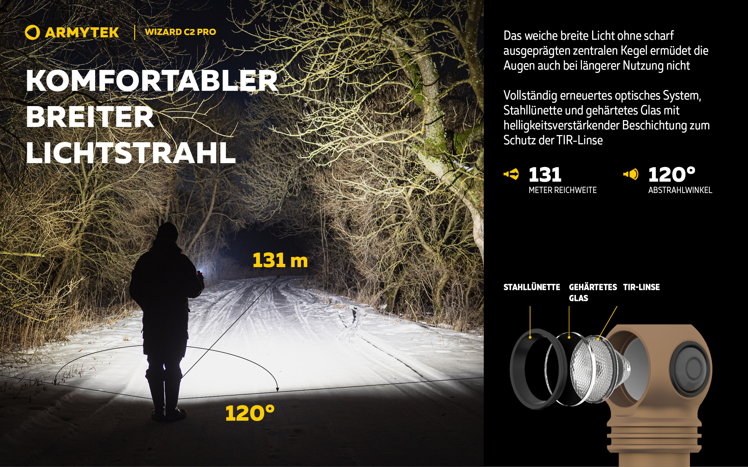 - Komfortabler breiter Strahl des vollständig überarbeiteten optischen Systems, Stahllünette und gehärtetes Glas mit helligkeitsverstärkender Beschichtung zum Schutz der TIR-Linse.