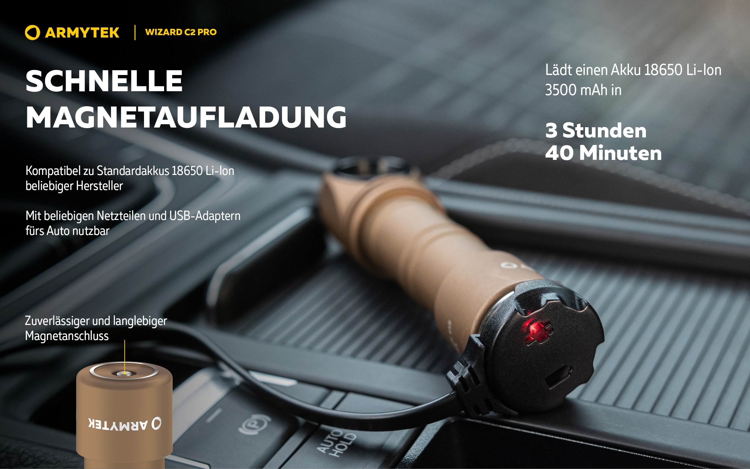 Schnelle magnetische Aufladung: der enthaltene 18650 Li-Ionen-Akku 3500 mAh wird aufgeladen in 3 h 40 min.