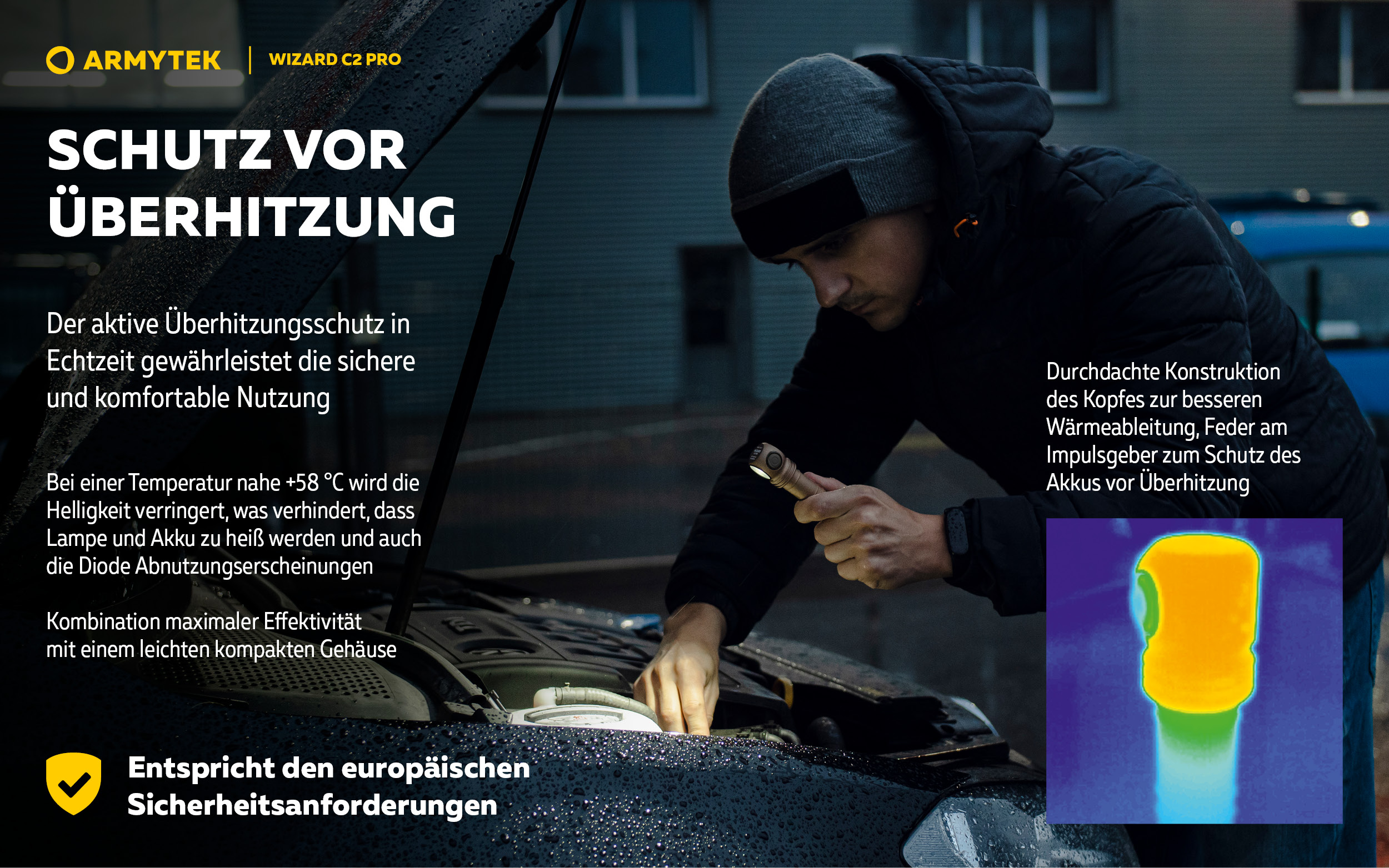 - Schutz vor Überhitzung über +58 °C in Echtzeit.
