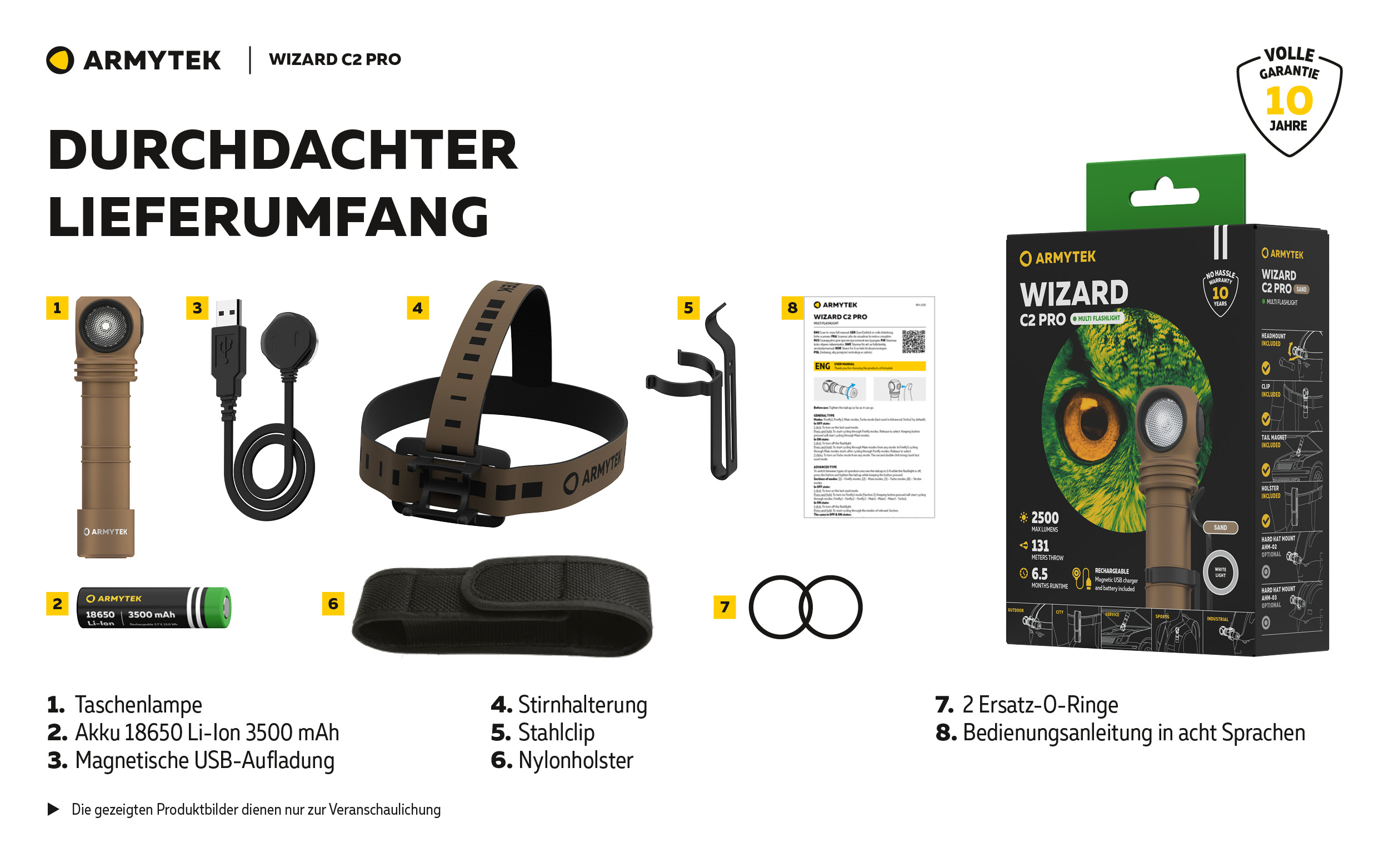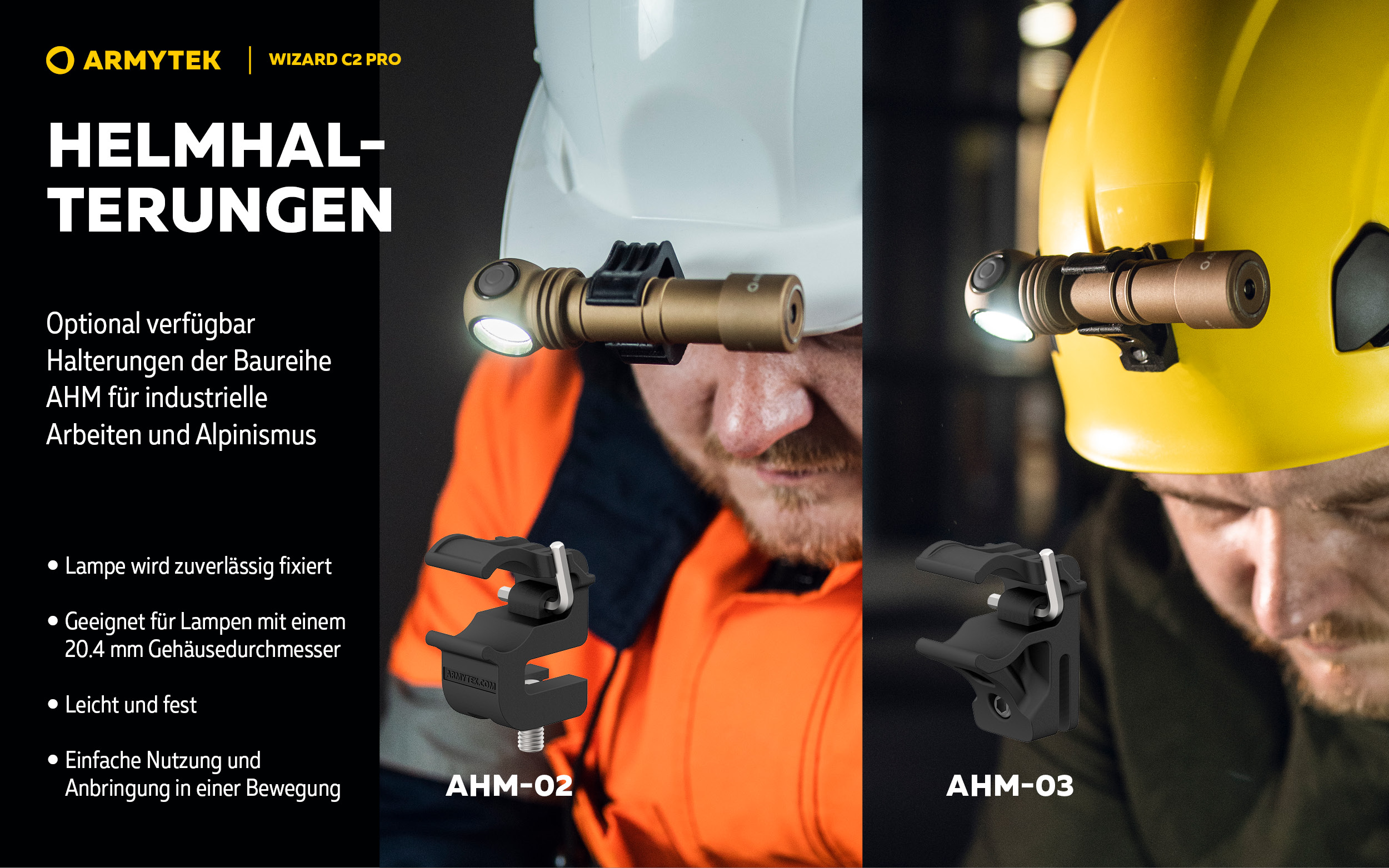 Das Lieferumfang enthält eine bequeme Stirnhalterung, einen Clip zum Anbringen an Kleidung oder Rucksack und ein robustes Nylonholster. Wizard C2 Pro ist kompatibel mit den Helmhalterungen der Baureihe AHM für industrielle Arbeiten und Alpinismus.