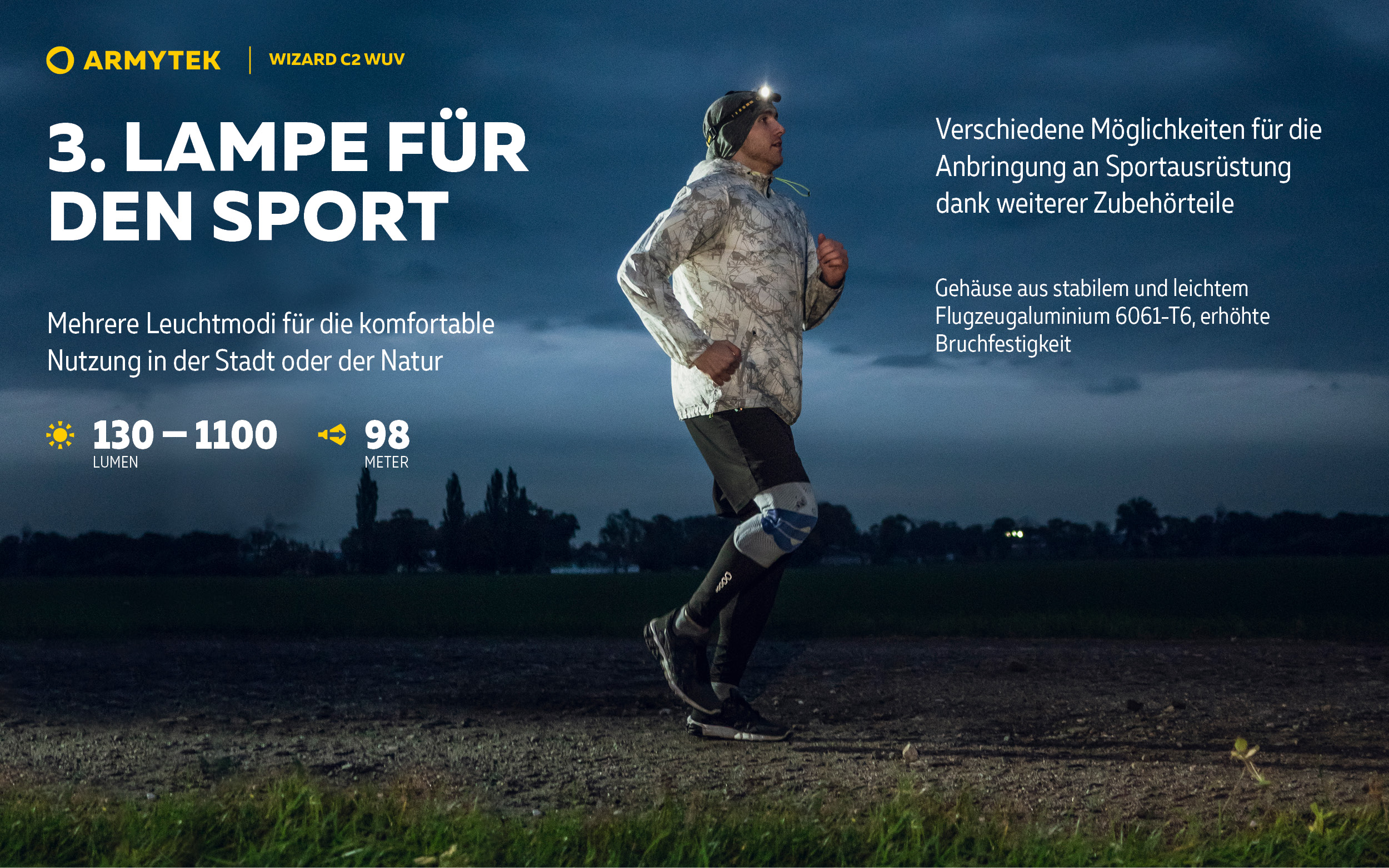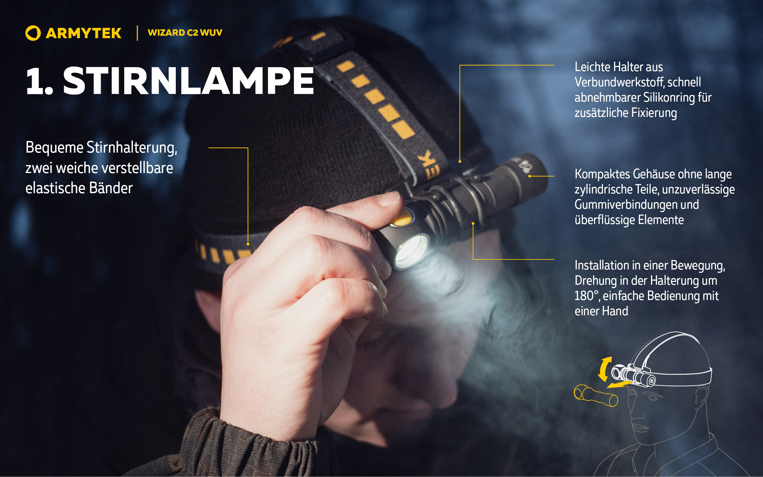 Dank mehrerer Befestigungsmöglichkeiten kann die Wizard C2 WUV universell eingesetzt werden: als Stirnlampe mithilfe der zuverlässigen Stirnhalterung, an einem beliebigen Kleidungsstück durch den Stahlclip, an metallischen Oberflächen dank des Magneten im hinteren Abdeckung. Das Modell ist kompatibel zu den Halterungen des Herstellers ABM-01 für die Anbringung am Fahrrad und AHM-02 für Schutzhelme.