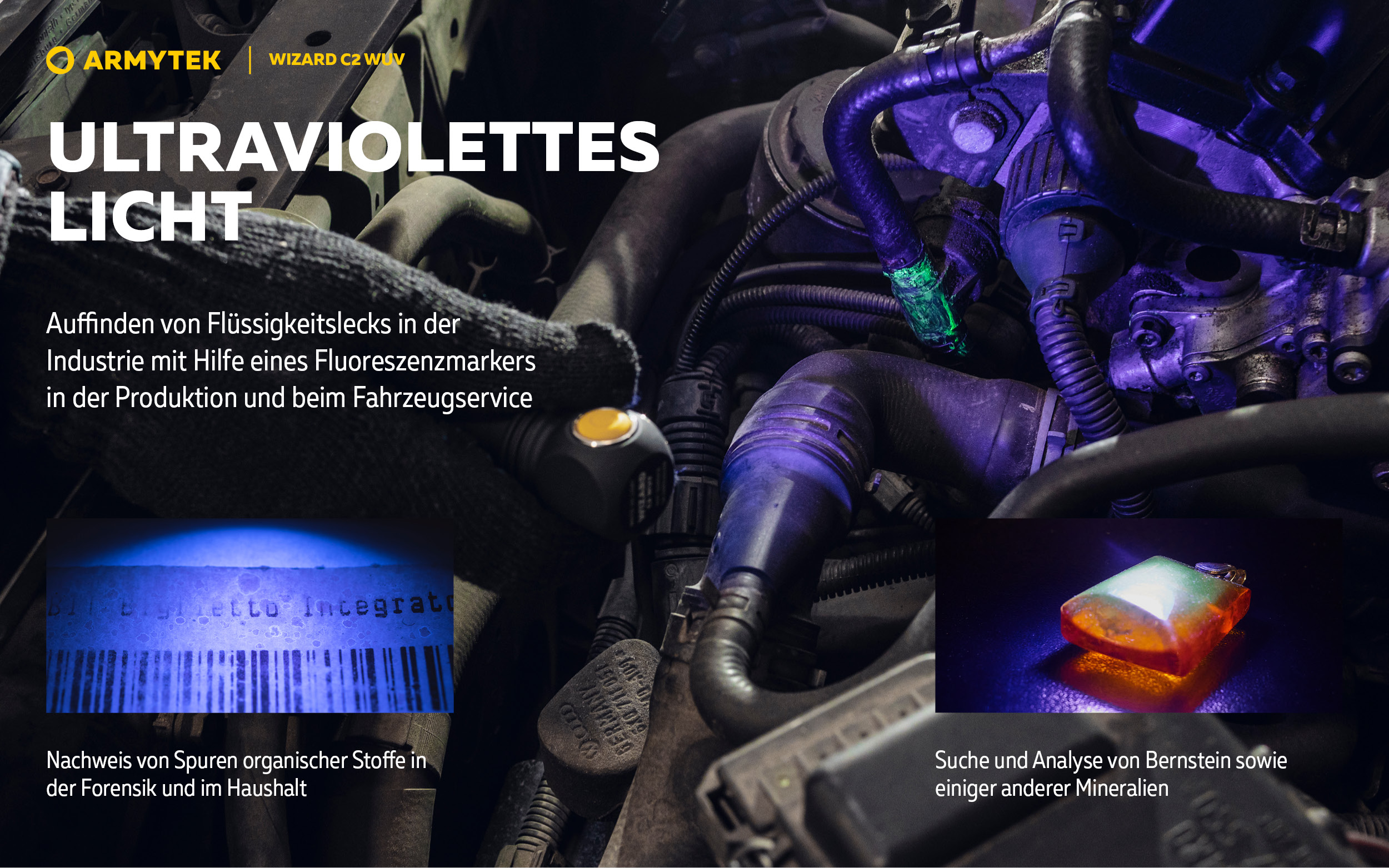 Das ultraviolette Licht ist zum Aufspüren von Flecken, Lecks, fluoreszierenden Markierungen, für die Suche nach Mineralien, die Ausführung von gerichtsmedizinischen Untersuchungen sowie die Überprüfung der Echtheit von Geld und Ausweisen vorgesehen.