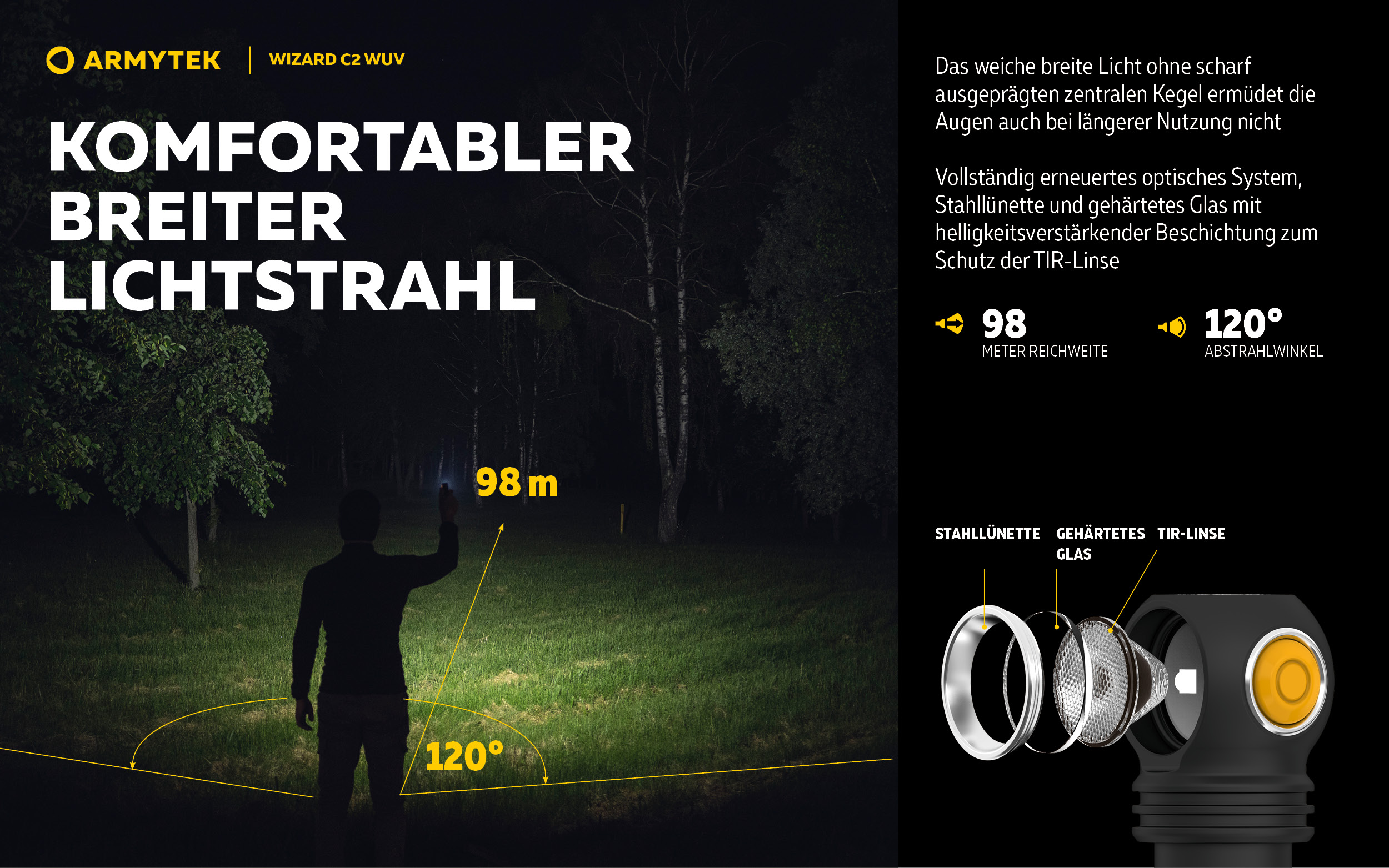 - Komfortabler breiter Lichtstrahl durch vollständig erneuertes optischen Systems, die TIR-Linse ist durch gehärtetes Glas mit helligkeitsverstärkender Beschichtung bruchgeschützt.