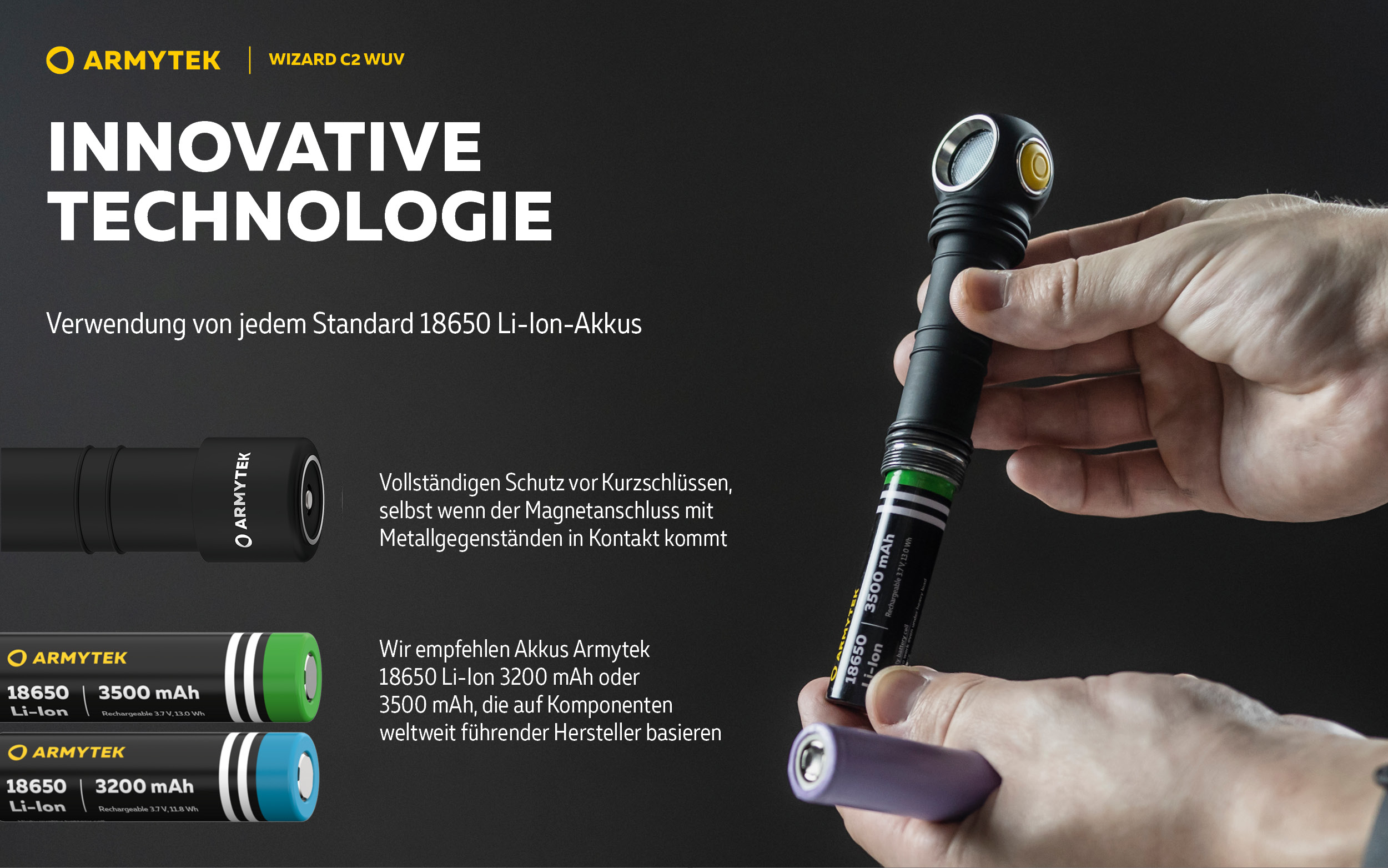 - Die innovative Technologie ermöglicht den Einsatz beliebiger 18650 Li-Ion-Akkus und gewährleistet den Schutz vor Kurzschlüssen sogar bei einem Kontakt des Magnetanschlusses mit metallischen Gegenständen.