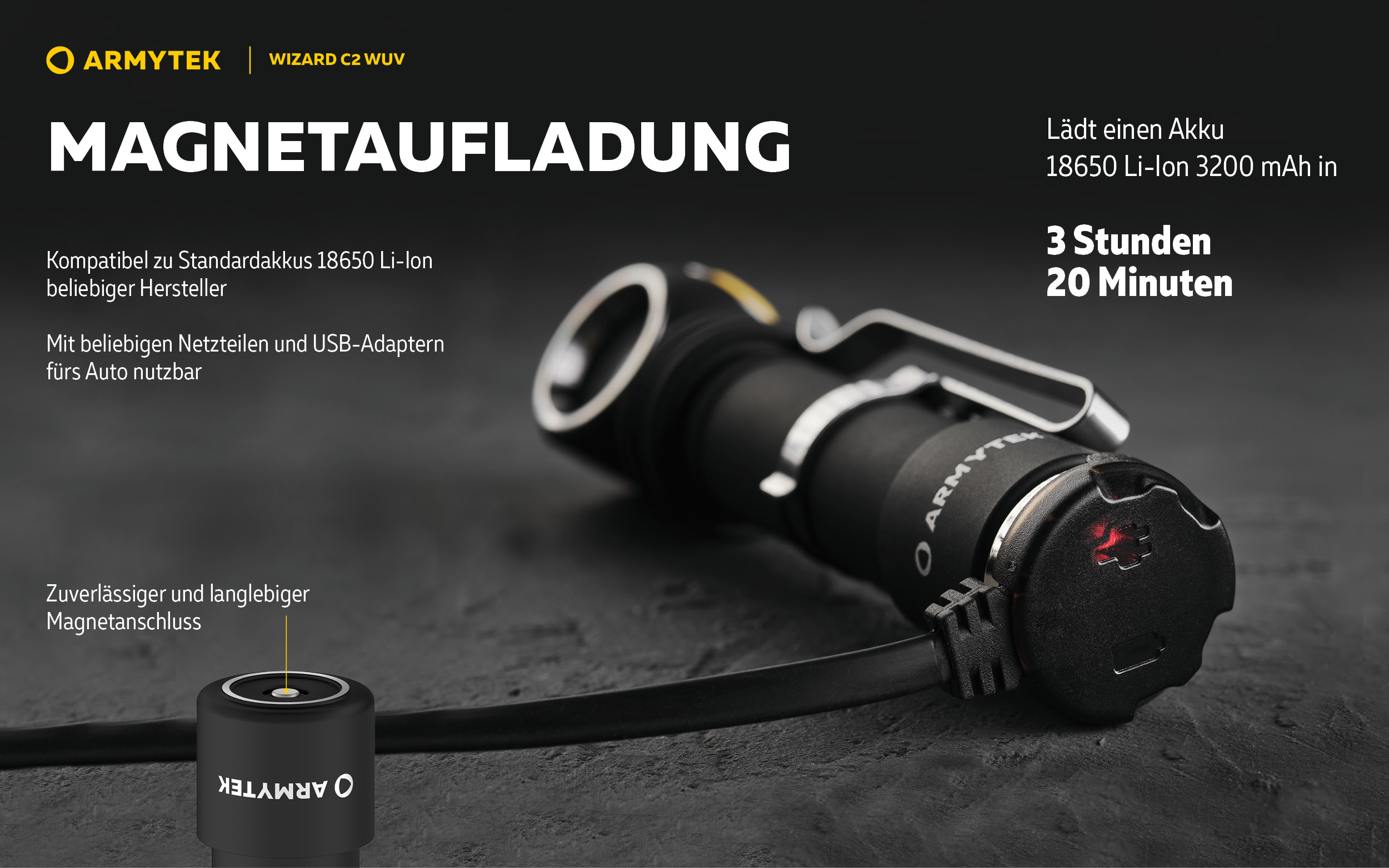 Schnelle Magnetaufladung: der enthaltene 18650 Li-Ionen-Akku 3200 mAh wird aufgeladen in 3 h 20 min.