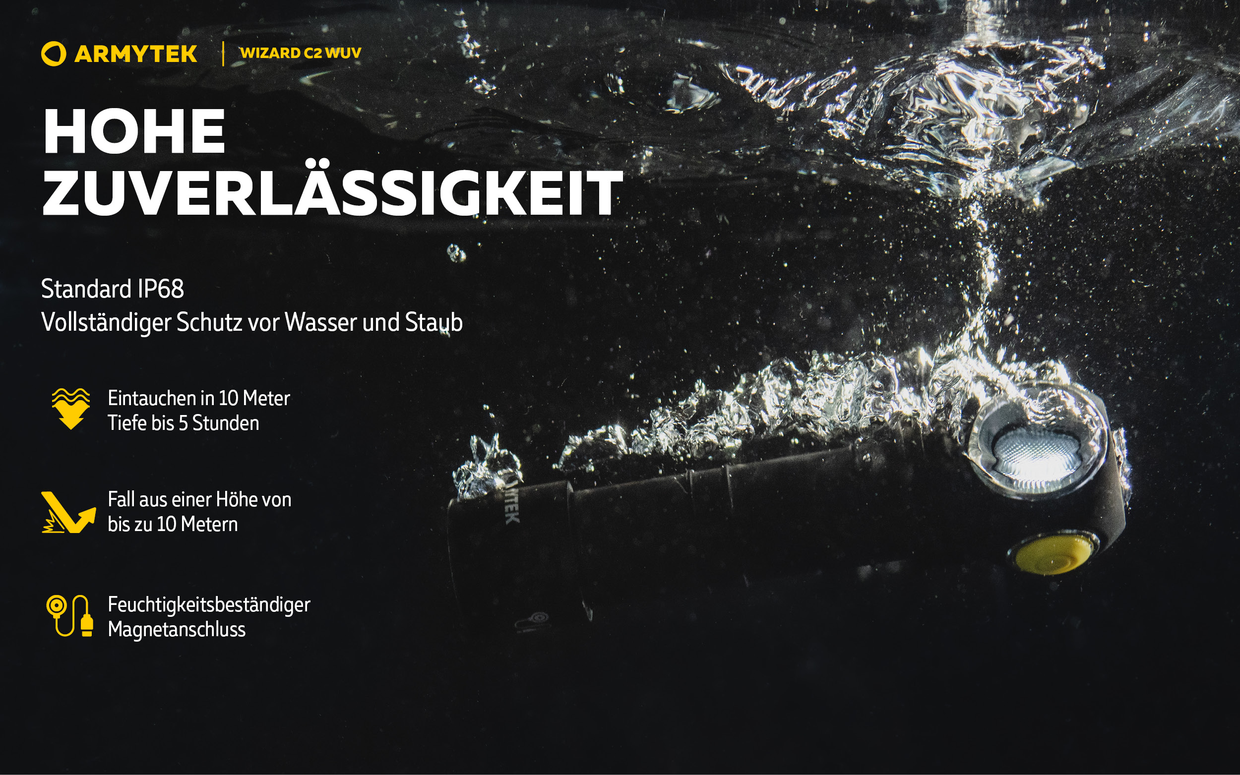 - Schutz vor Wasser, Schmutz und Staub nach IP68 — die Lampe leuchtet sogar in einer Tiefe von 10 Metern. Übersteht den Fall aus einer Höhe von bis zu 10 Metern.