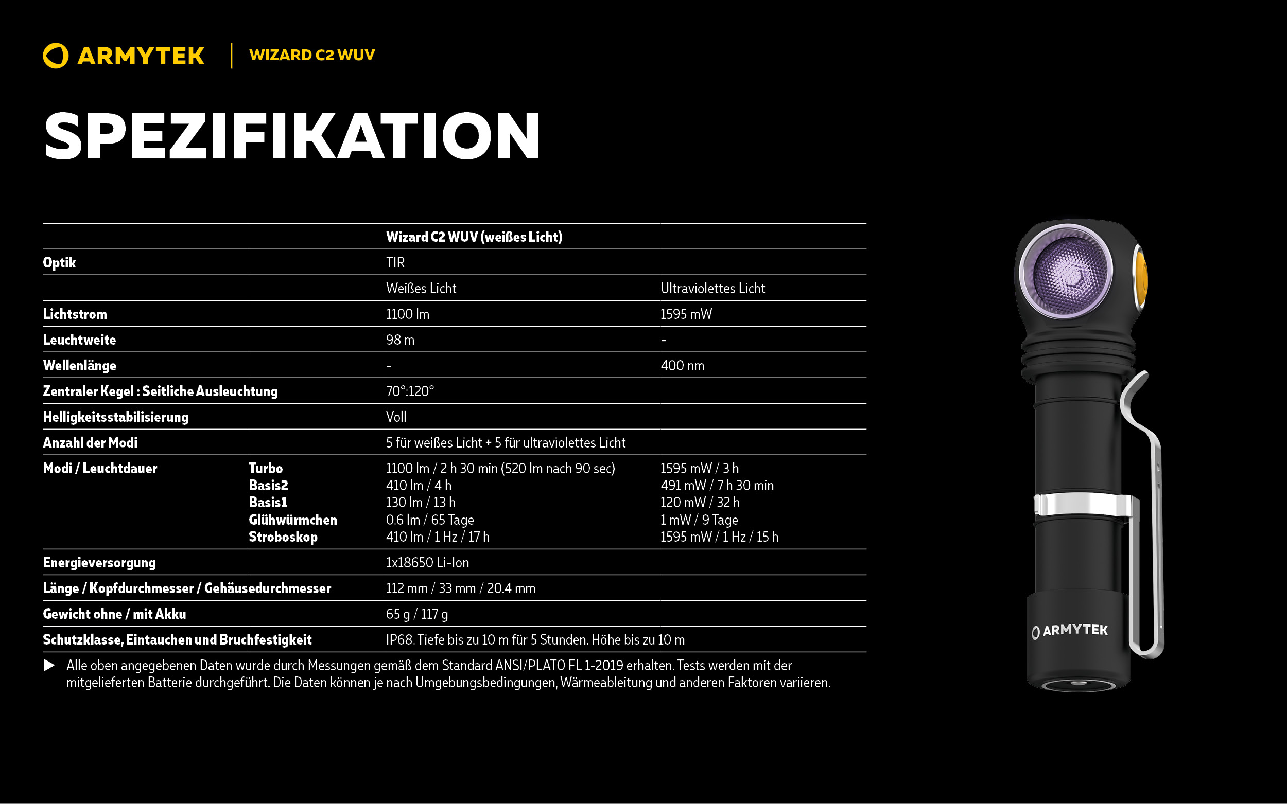 | Turbo | 1100 lm / 2 h 30 min (520 lm nach 90 sec) |