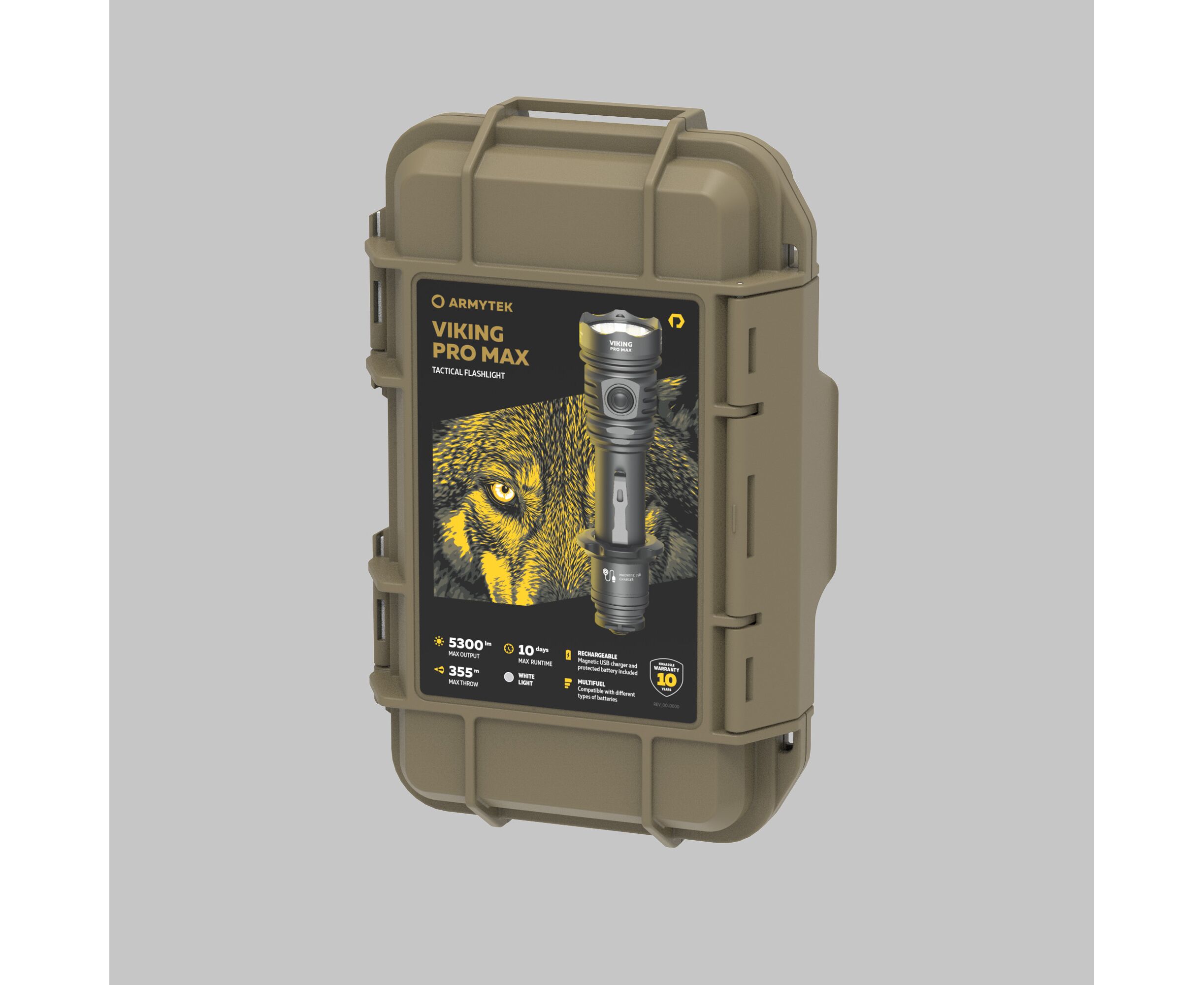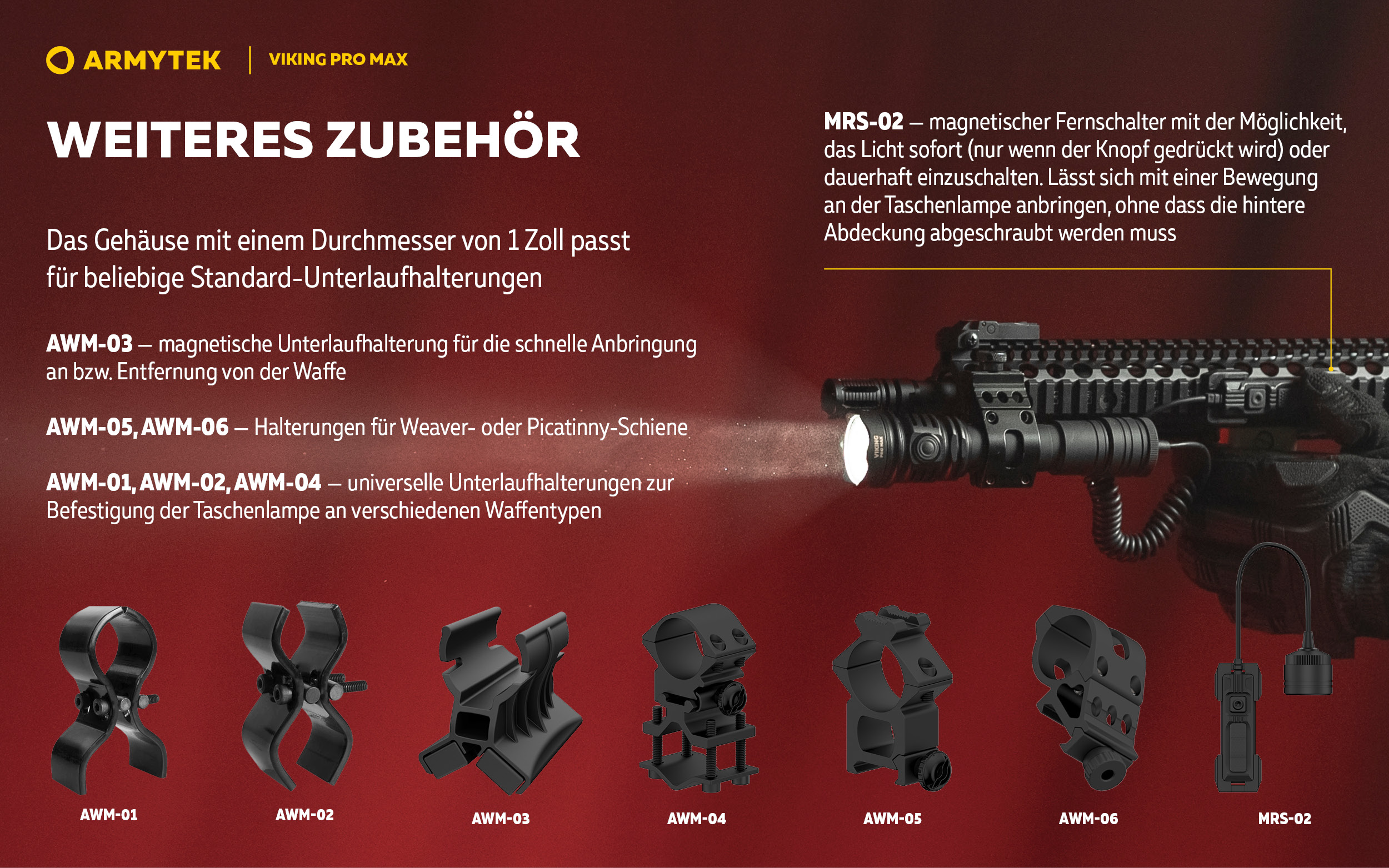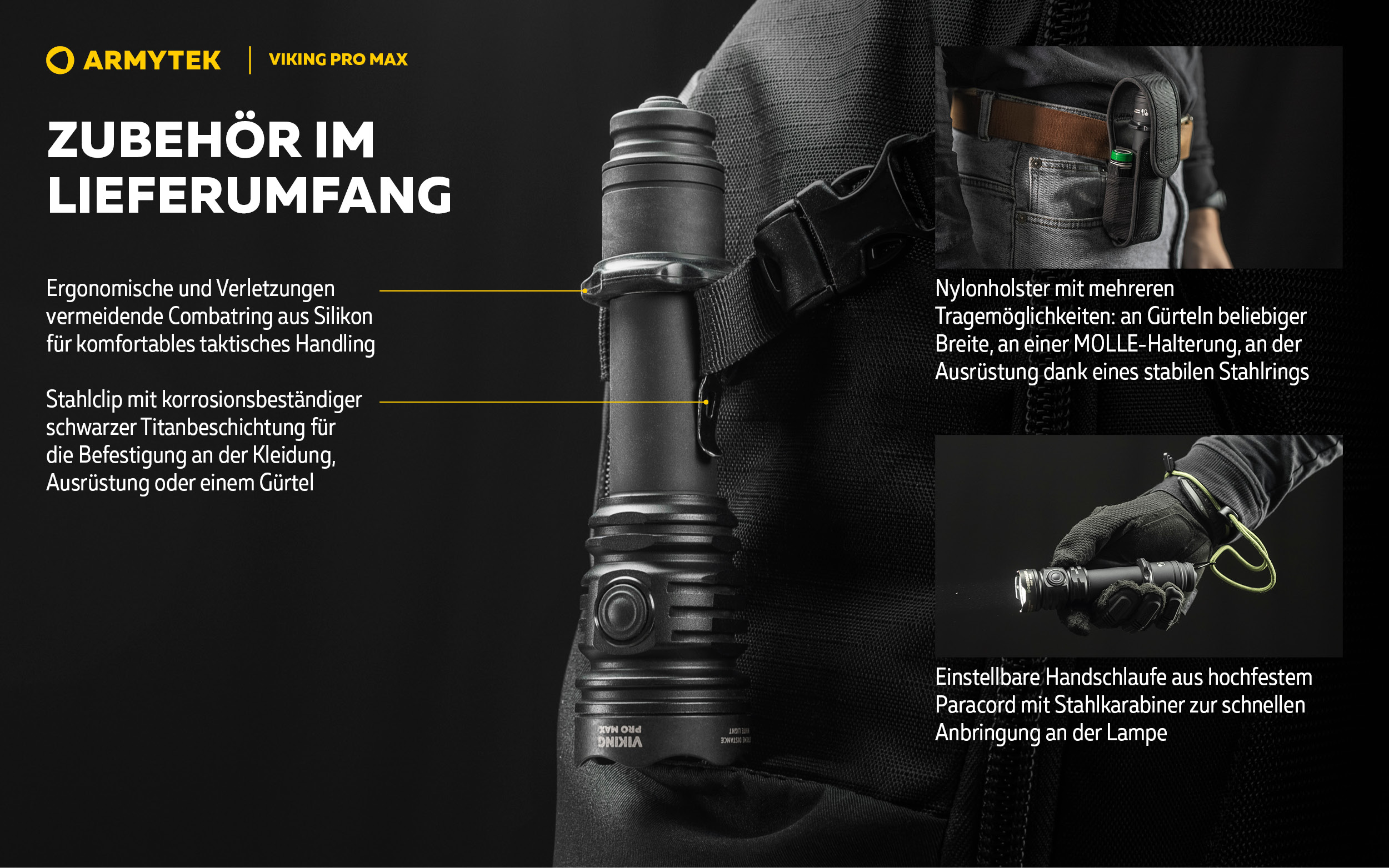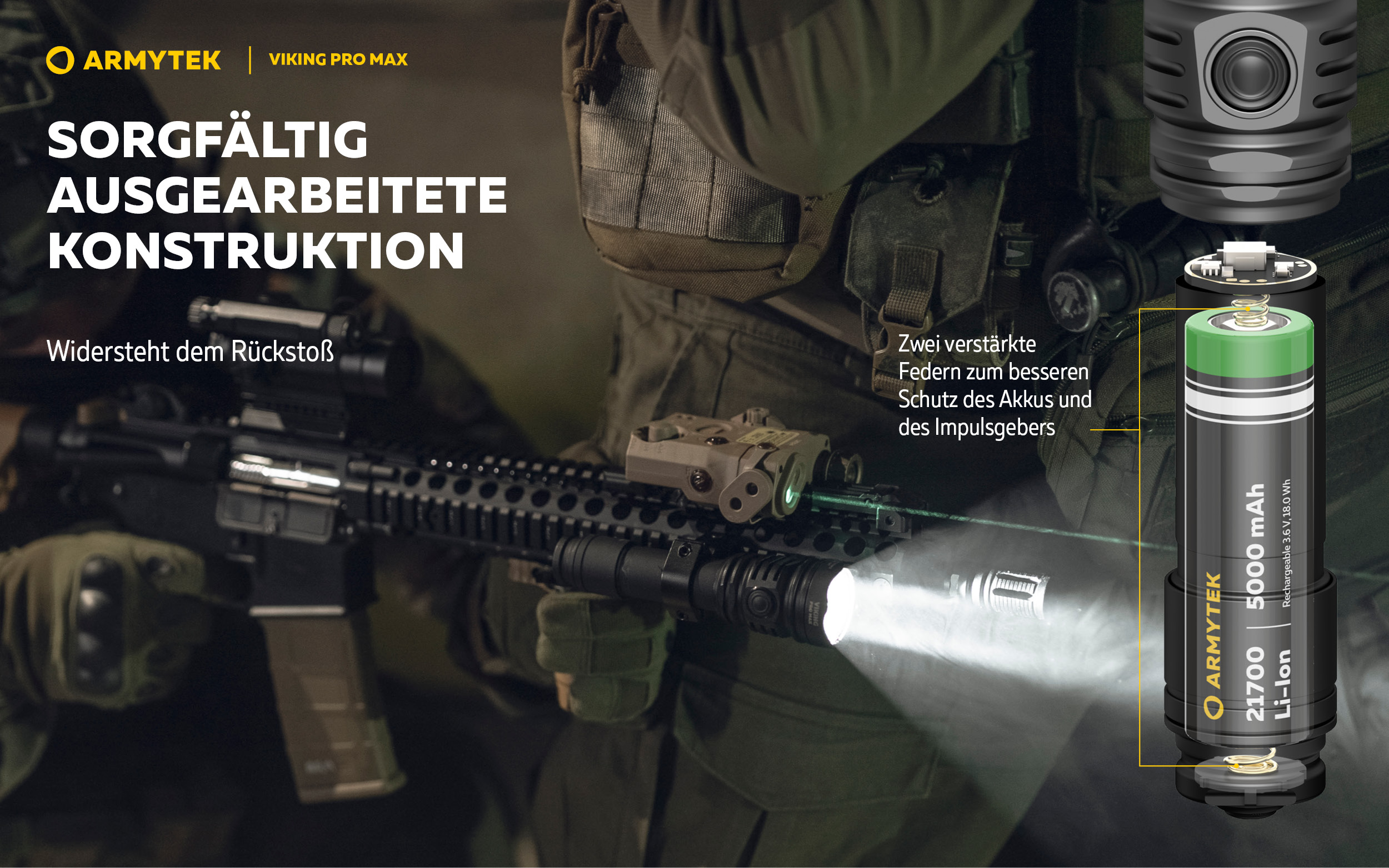 Die Viking Pro Max ist auch mit der speziell entworfenen magnetischen Fernschalter und den Original-Unterlaufhalterungen kompatibel. Das Model lässt sich nicht nur mit dem mitgelieferten Akku, sondern auch mit jedem Standard 21700 Li-Ionen-Akku und, dank des Adapters, mit einem 18650 Li-Ionen-Akku oder zwei CR123A Lithium-Batterien betreiben. Die Variabilität der Stromquellen vergrößert die Unabhängigkeit deutlich.