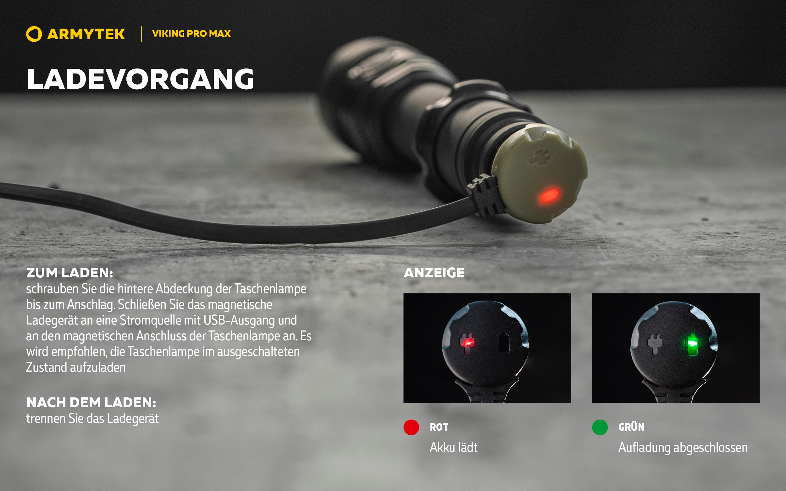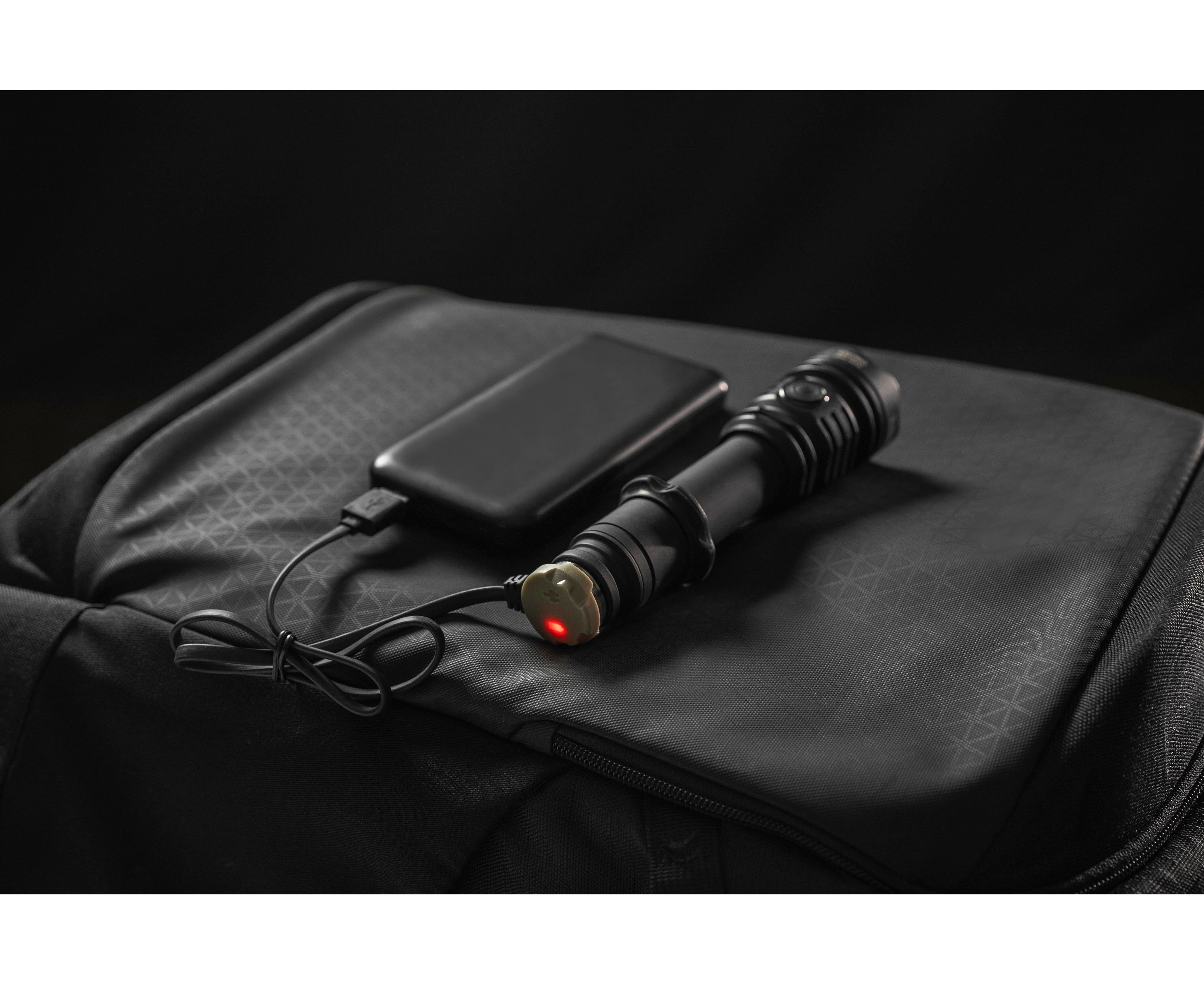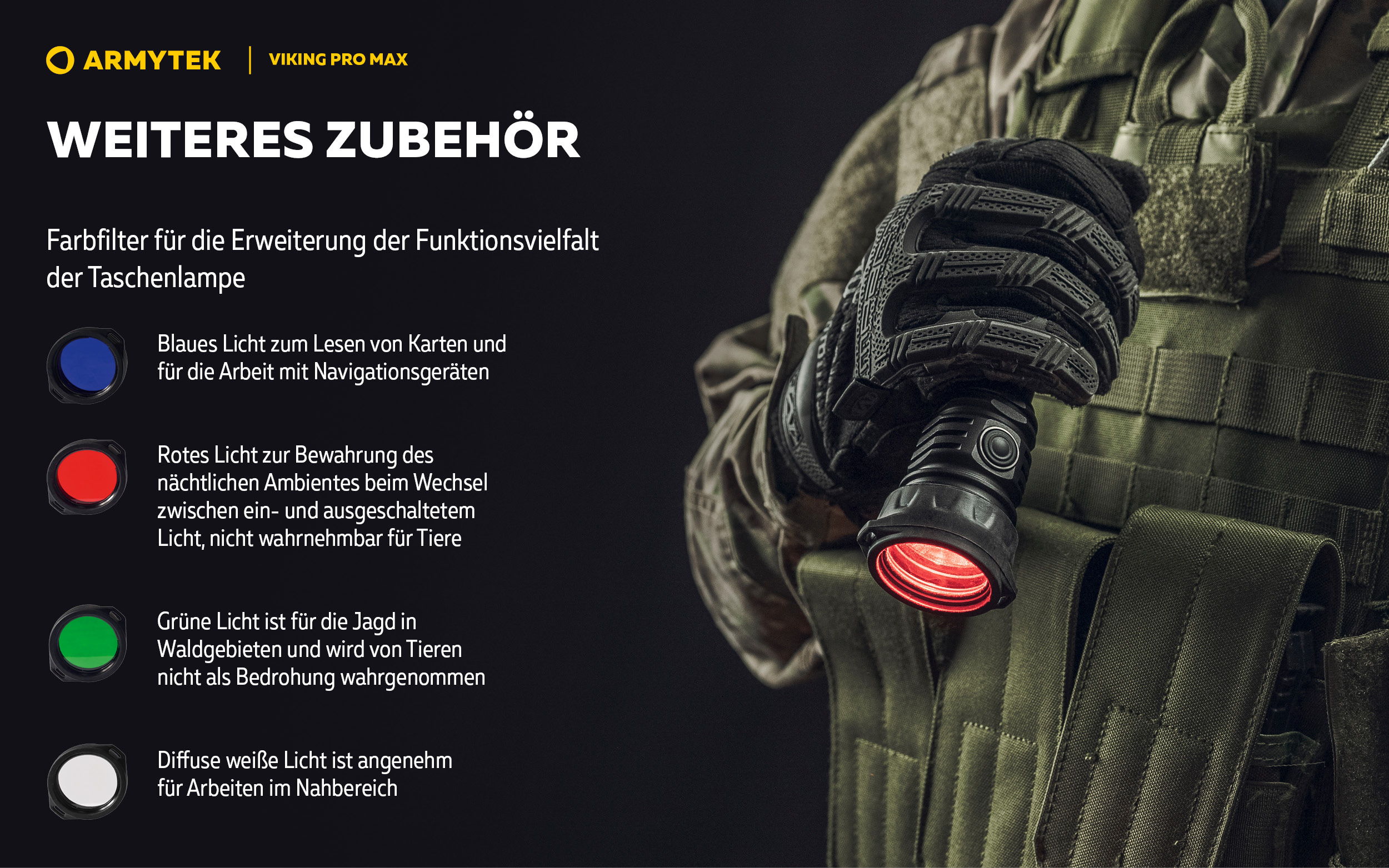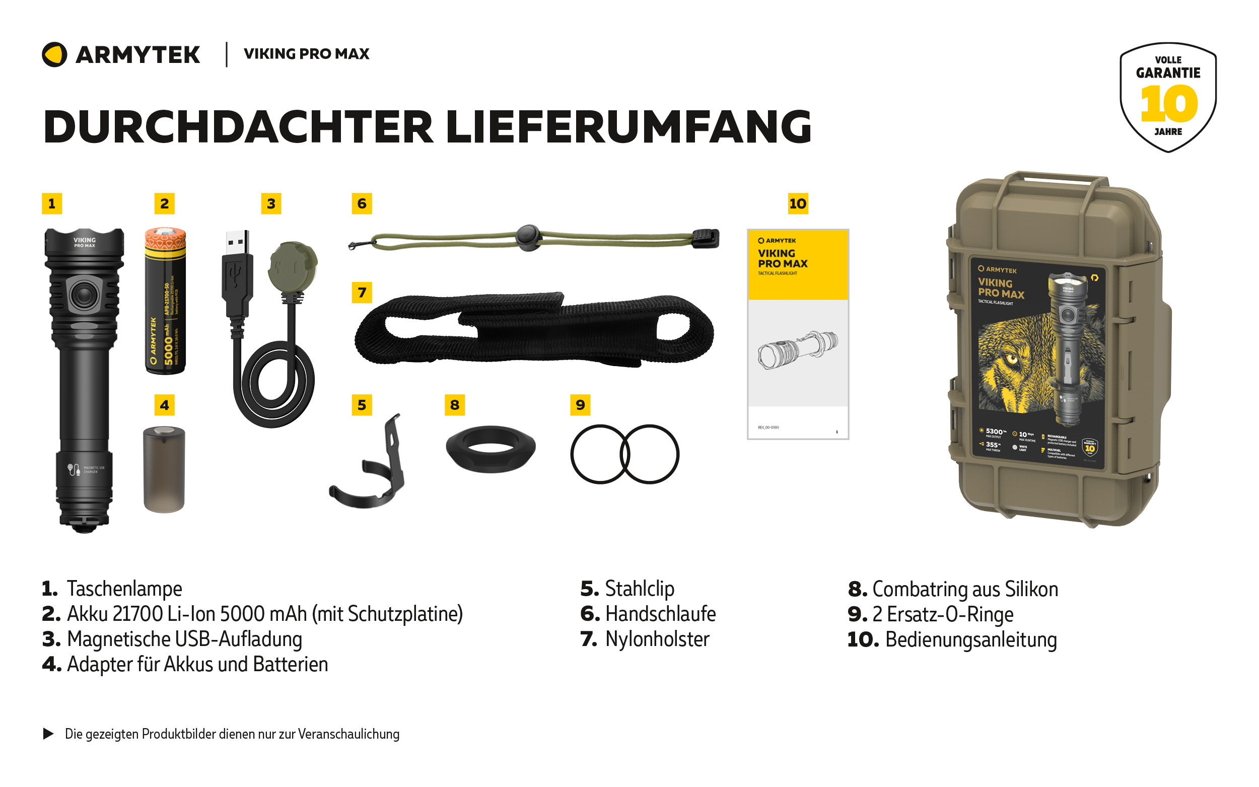 Die Viking Pro Max ist auch mit der speziell entworfenen magnetischen Fernschalter und den Original-Unterlaufhalterungen kompatibel. Das Model lässt sich nicht nur mit dem mitgelieferten Akku, sondern auch mit jedem Standard 21700 Li-Ionen-Akku und, dank des Adapters, mit einem 18650 Li-Ionen-Akku oder zwei CR123A Lithium-Batterien betreiben. Die Variabilität der Stromquellen vergrößert die Unabhängigkeit deutlich.