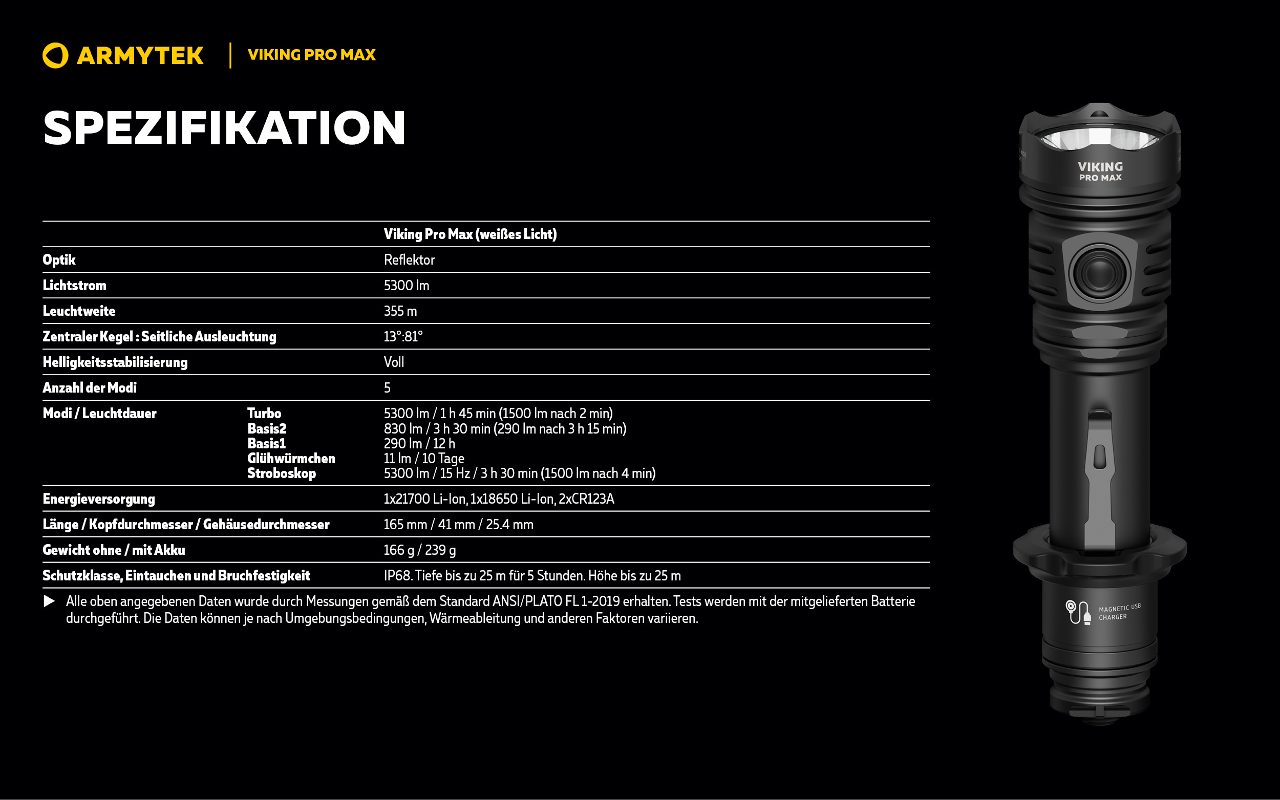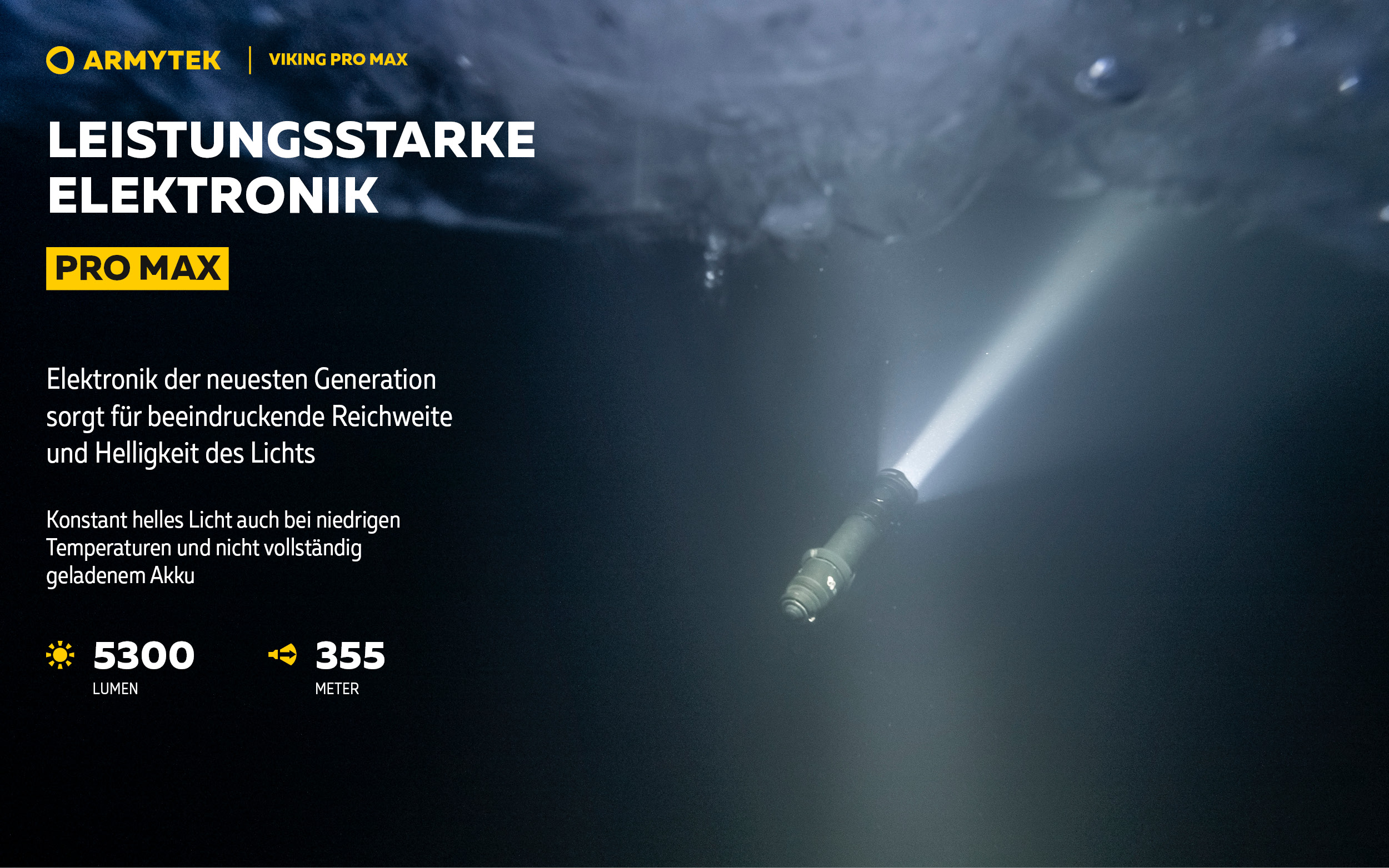 - Pro Max Elektronik der neuesten Generation gewährleistet eine beeindruckende Reichweite von 355 Metern und eine Lichtleistung von 5300 Lumen. Konstant helles Licht auch bei niedrigen Temperaturen und nicht vollständig geladenem Akku.