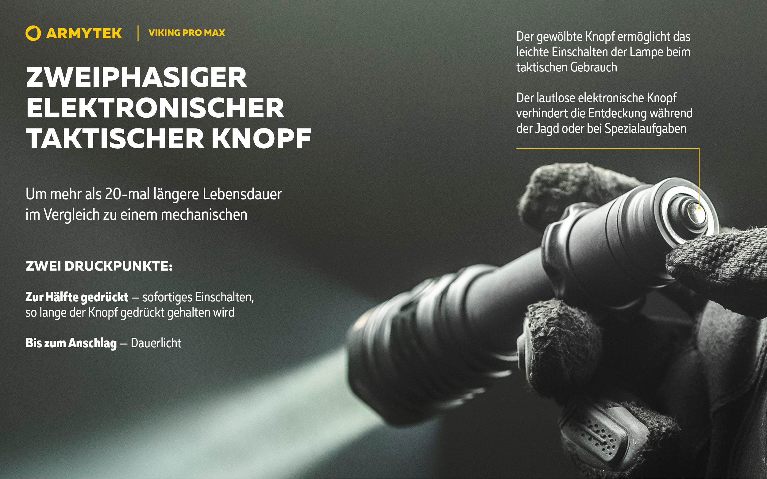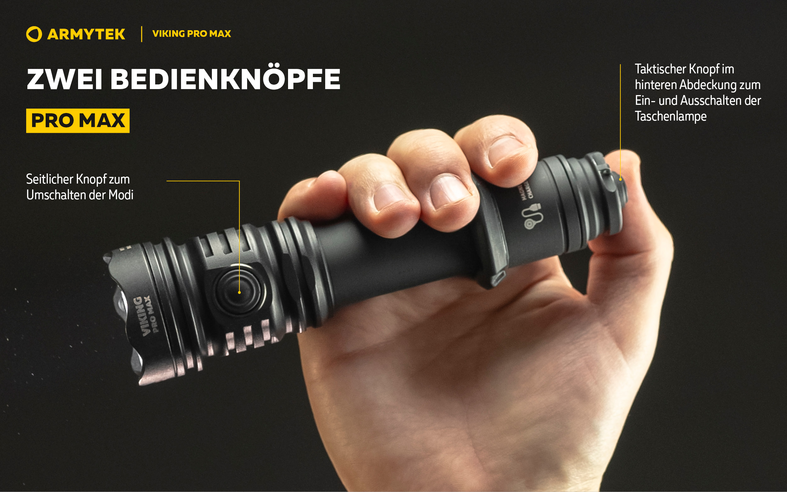 - Pro Max Zwei Bedienknöpfe: ein taktischer Knopf im hinteren Abdeckung zum Ein- und Ausschalten der Taschenlampe und ein seitlicher Knopf zum einhändigen Umschalten der Modi.