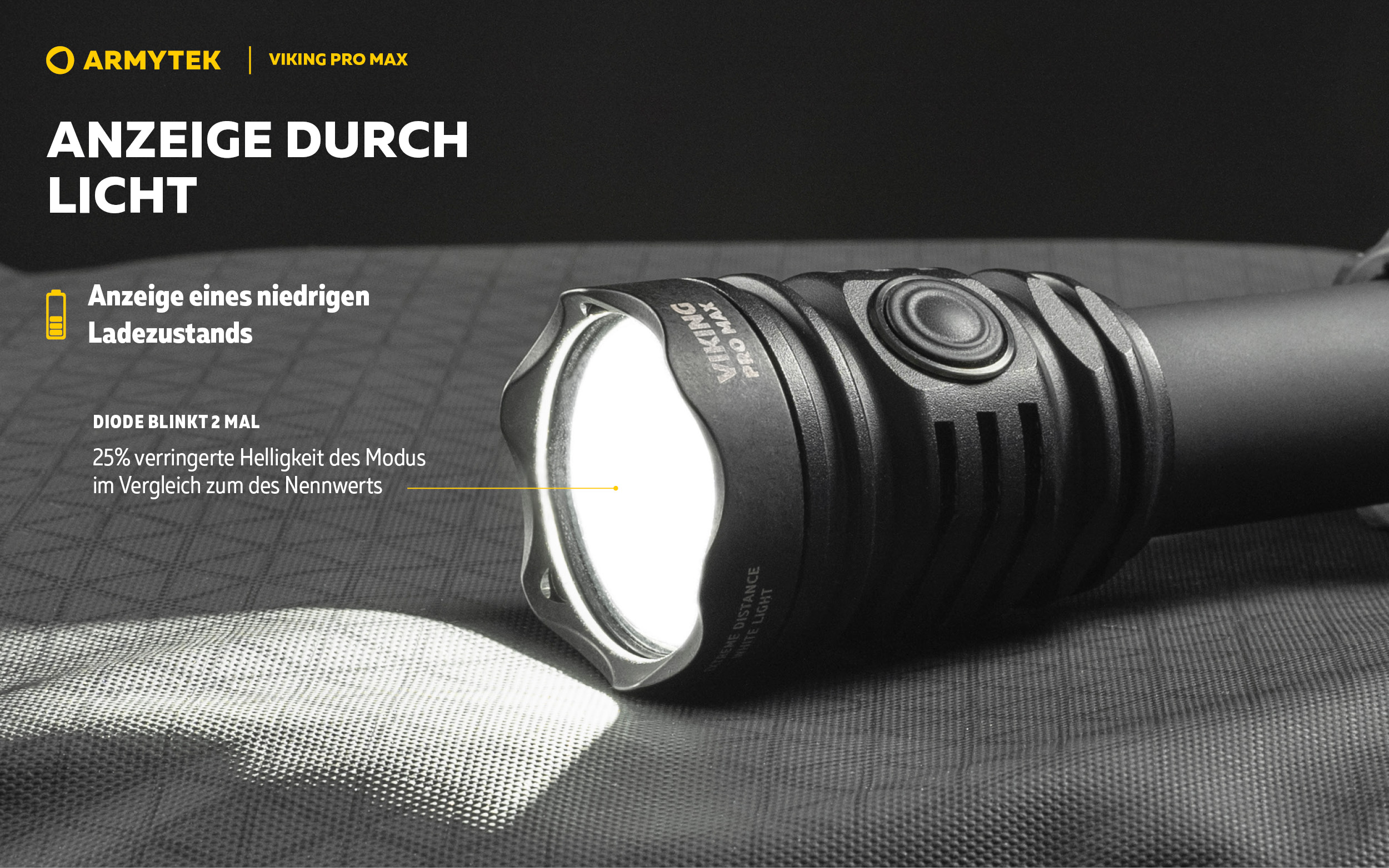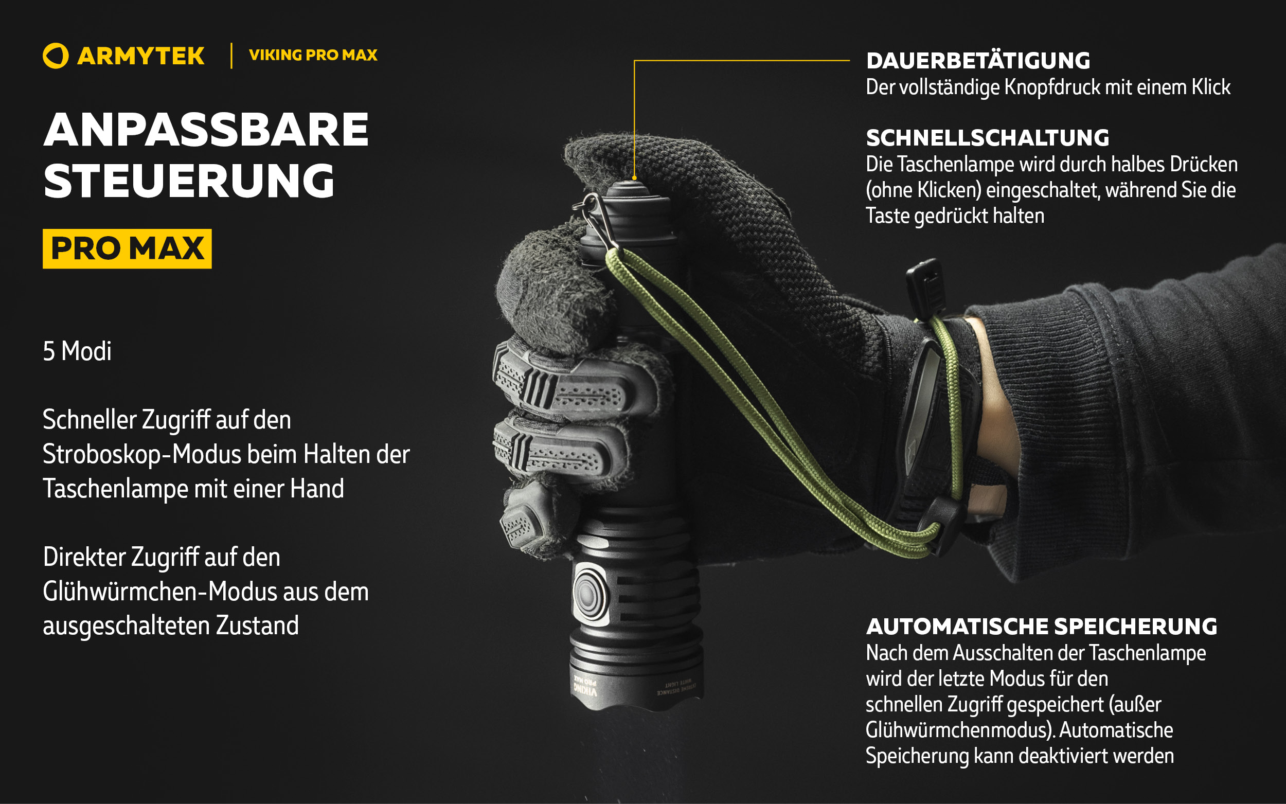 - Pro Max Direkter Zugriff auf den Stroboskop-Modus beim Halten der Taschenlampe mit einer Hand.