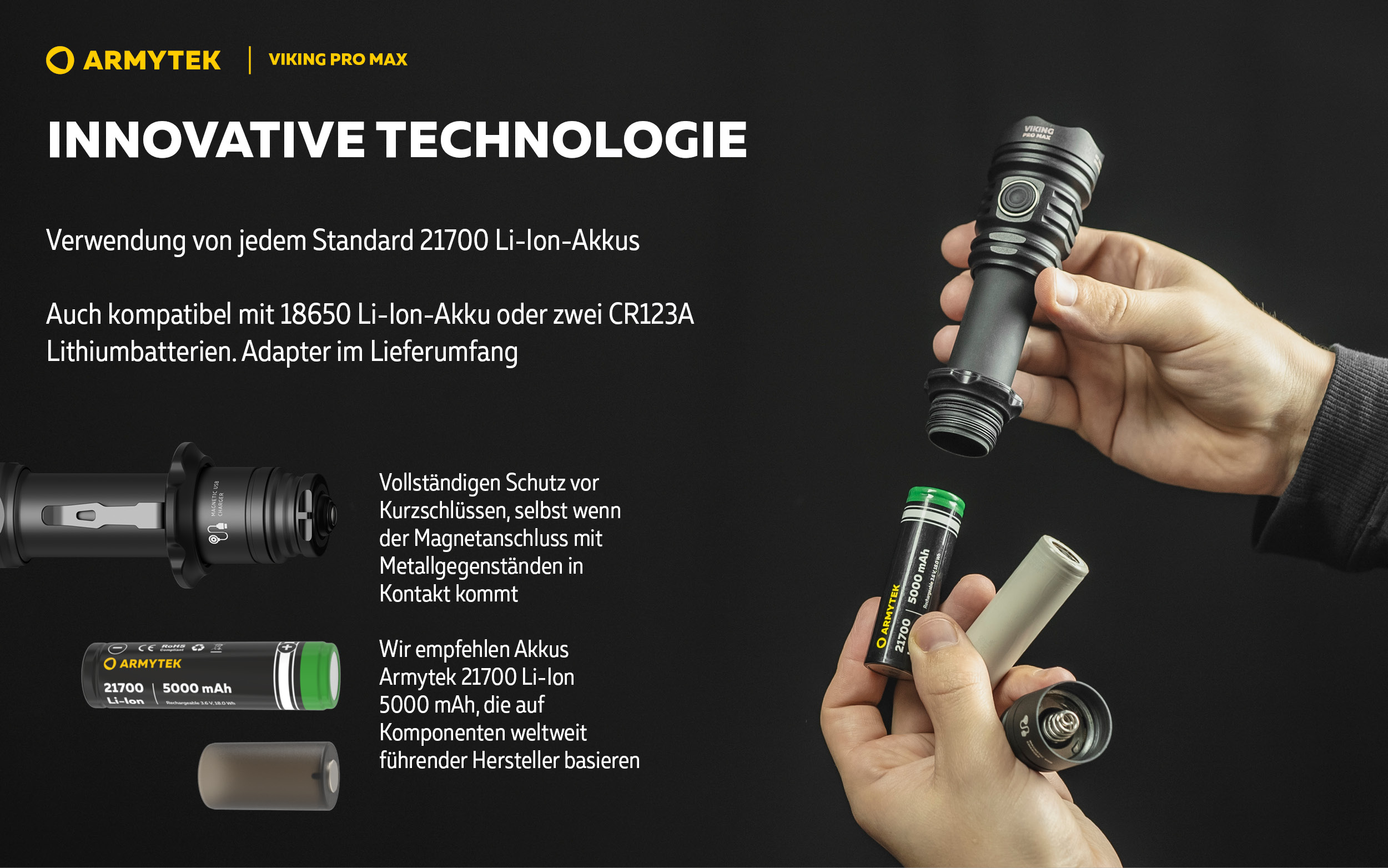 - 21700 Li-Ion-Akku im Lieferumfang, auch kompatibel mit 18650 Li-Ion-Akku oder 2xCR123A Batterien.