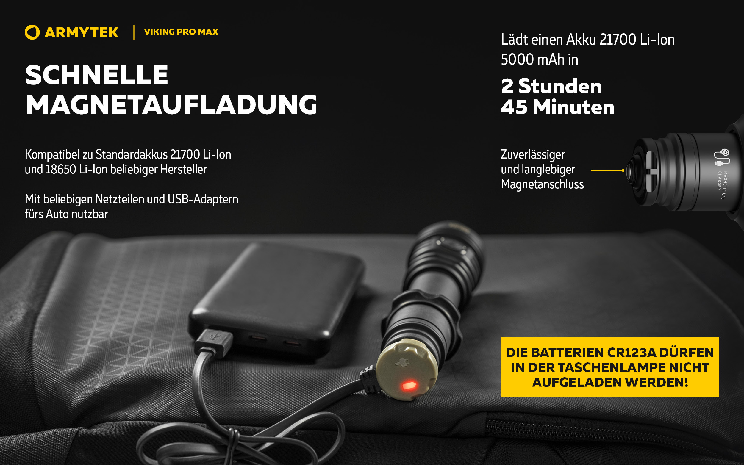 Schnelle Magnetaufladung: der enthaltene 21700 Li-Ionen-Akku 5000 mAh wird aufgeladen in 2 h 45 min.
