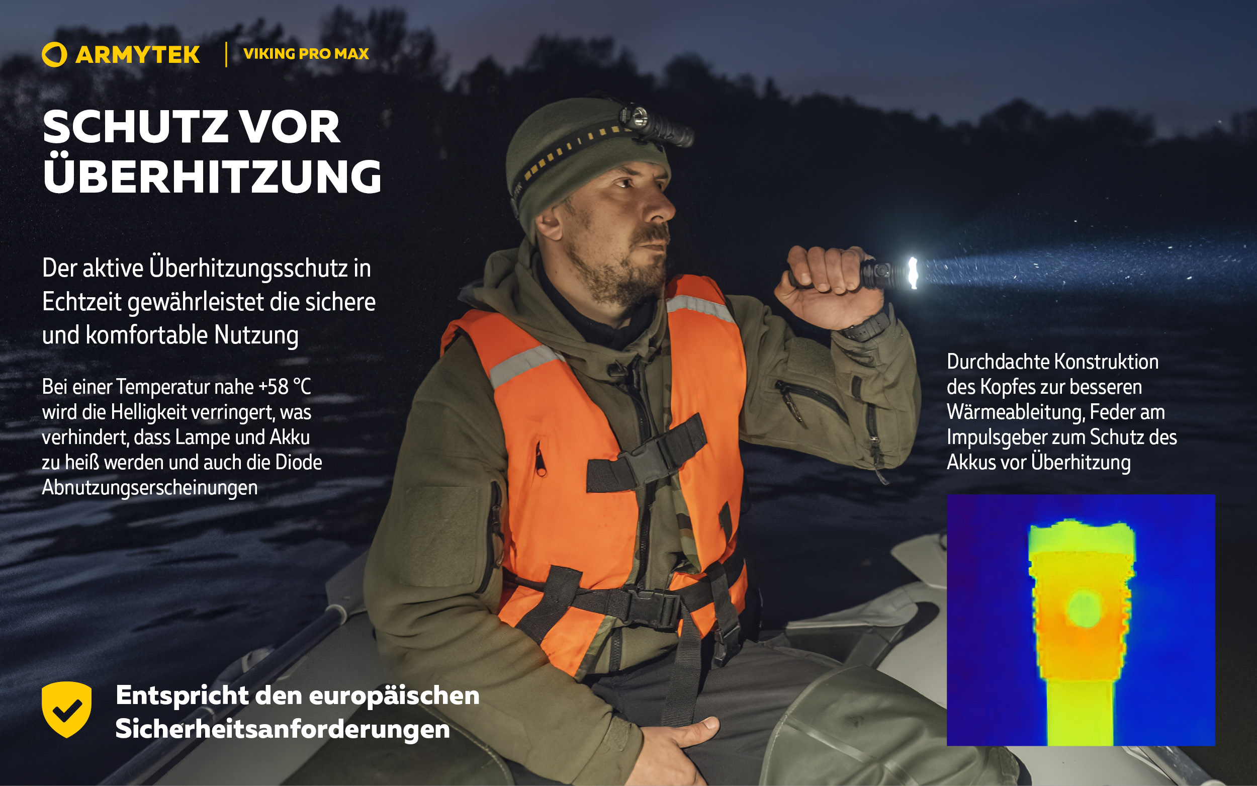Verbesserter aktiver Schutz vor Überhitzung in Echtzeit: gewährleistet die sichere und komfortable Nutzung. Bei einer Temperatur nahe +58 °C wird die Helligkeit verringert, was verhindert, dass Lampe und Akku zu heiß werden und auch die Diode Abnutzungserscheinungen. Entspricht den europäischen Sicherheitsanforderungen.