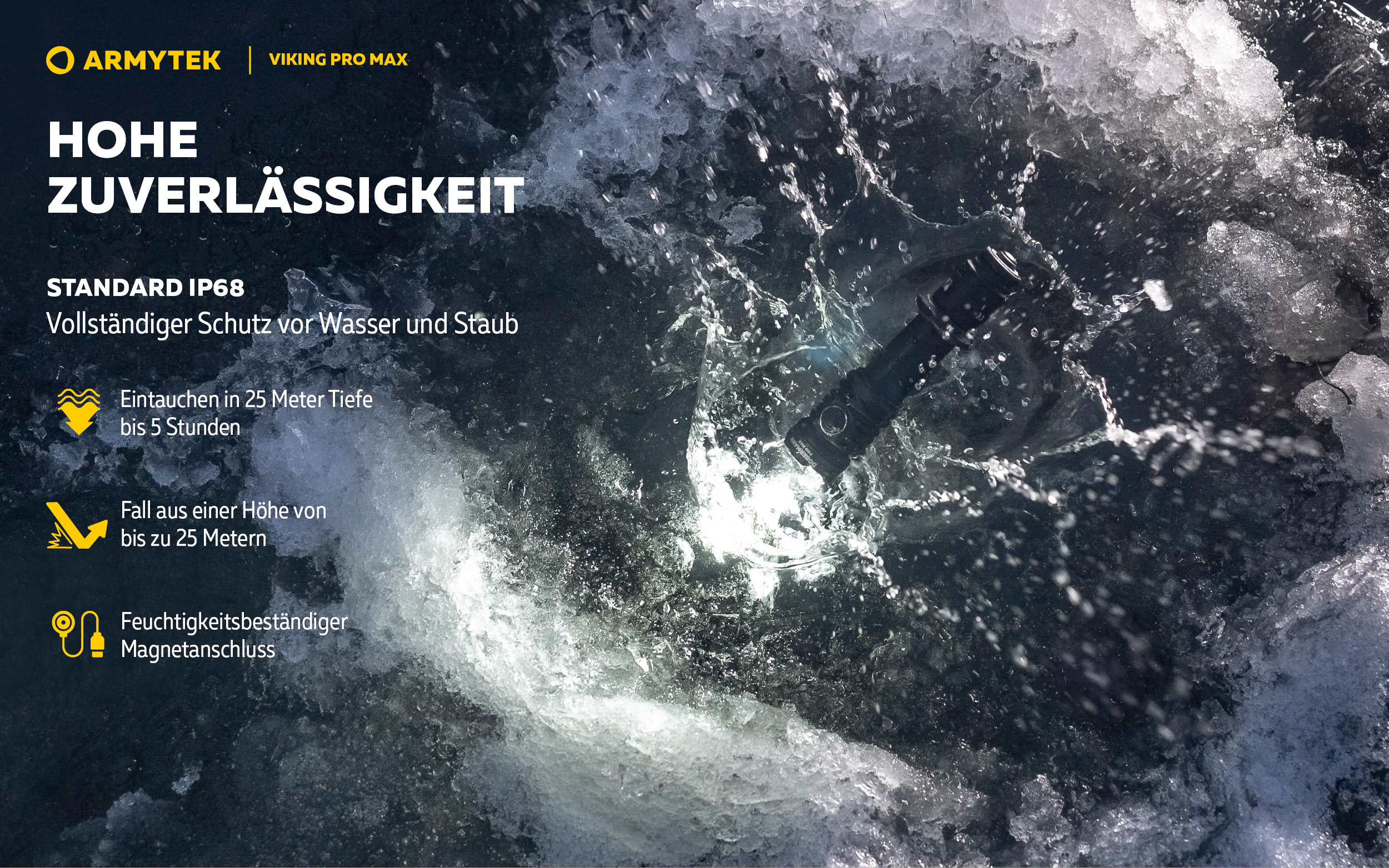 - Vollständiger Schutz vor Wasser, Schmutz und Staub gemäß Standard IP68 — die Taschenlampe arbeitet sogar noch nach dem Eintauchen in eine Tiefe von 25 Metern. Übersteht den Fall aus dem 10. Stockwerk.